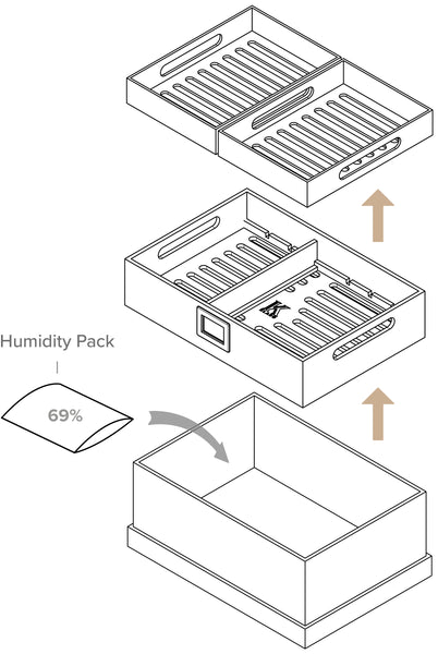 Temporarily remove the top plastic trays and the cedar wood bottom storage tray. Place your humidity pack on the bottom of the plastic base. After, put the acrylic and wood trays back. The Felix is designed to accommodate several humidity packs, so feel free to add additional packs to the top plastic trays or under the wood cedar tray to increase the humidity.