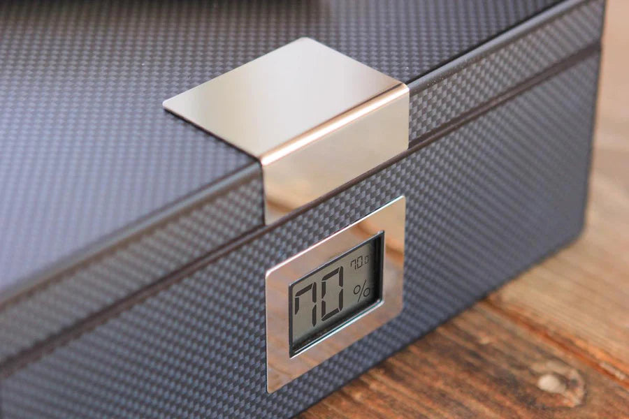 Wir stellen den Kingston Carbon Fiber Finish Humidor vor. Wir haben auf die harte Tour herausgefunden, dass die Reifung Ihrer Zigarren ein kniffliger Prozess sein kann und am Ende weitgehend ungenau ist. Um dieses branchenweite Problem zu lösen, haben wir sorgfältig ein digitales Hygrometer in die Vorderseite des Humidors eingebaut, das die Luftfeuchtigkeit präzise überwacht. Wir haben diesen Humidor gründlich in feuchten, gemäßigten und trockenen Umgebungen getestet, um die besten Feuchtigkeitsniveaus für Ihre Zigarren zu gewährleisten. Dieser Premium-Humidor verfügt über ein modernes Kohlefaser-Finish, ein digitales Hygrometer an der Vorderseite, das zum Patent angemeldete Hydro-System, spanisches Zedernholz und das dichteste Magnetgehäuse auf dem Markt.