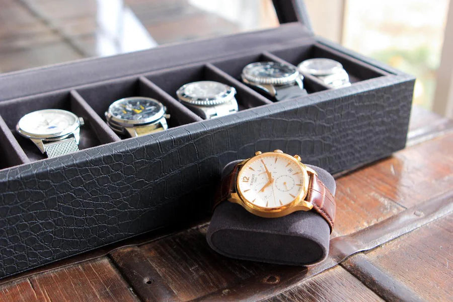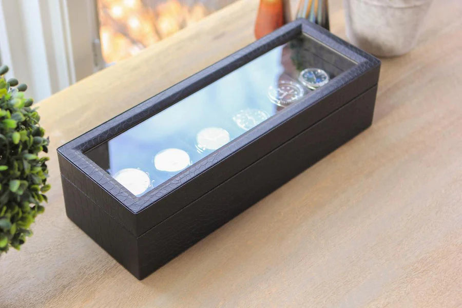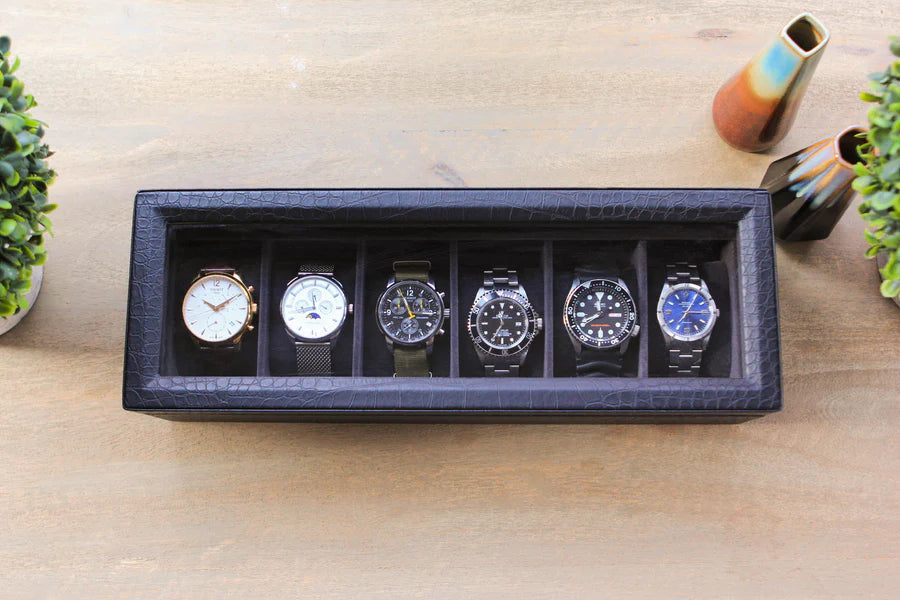 Finished with a luxurious and striking exterior made of black faux crocodile leather. Nestle up to six watches in the buttery-soft velvet interior and see your watches come to life.