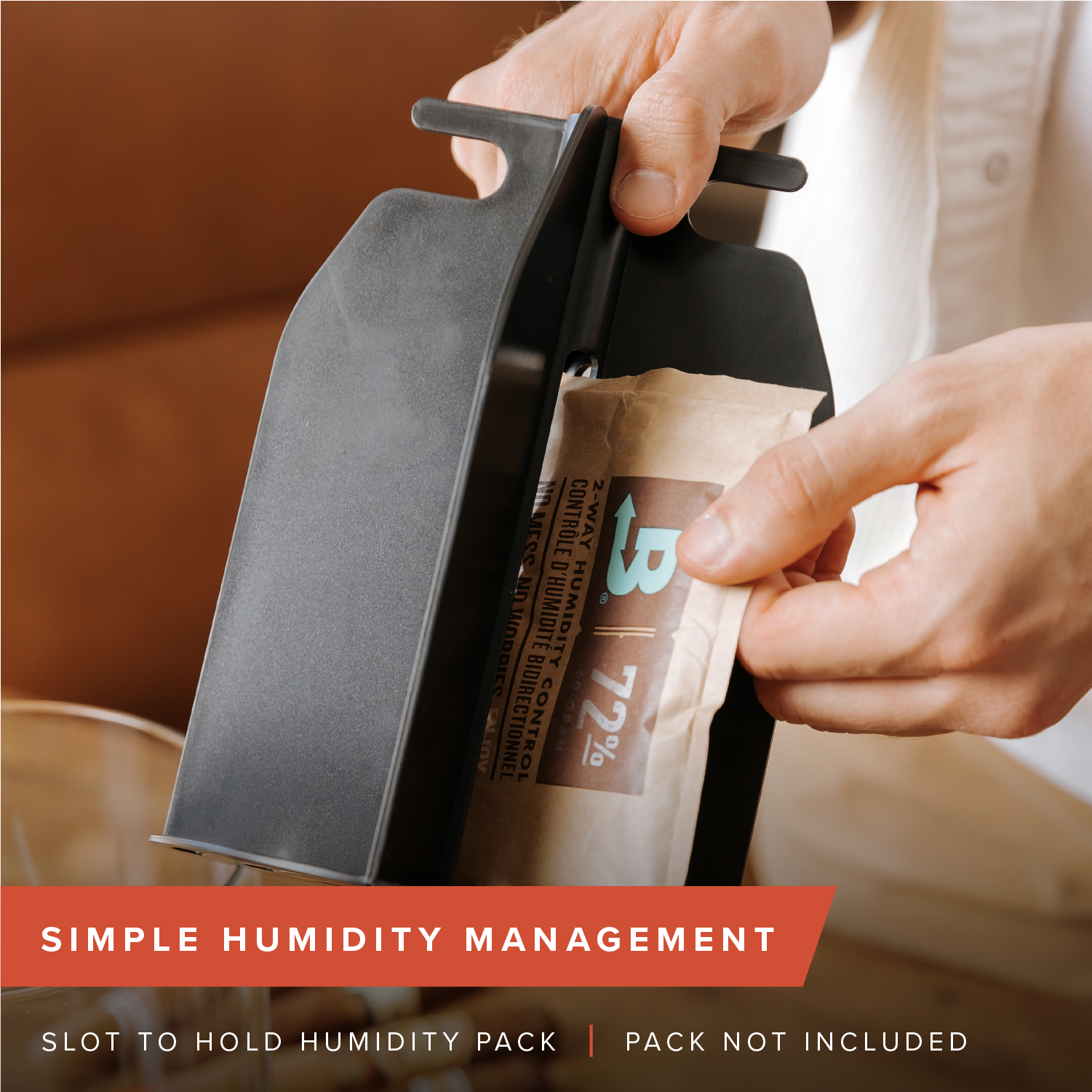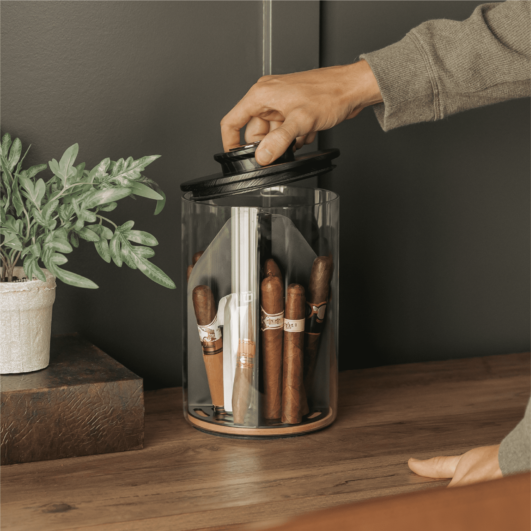 El Cylindor cuenta con una elegante tapa de acacia que sella la humedad, coronada con un higrómetro digital para una precisión en la que puede confiar.