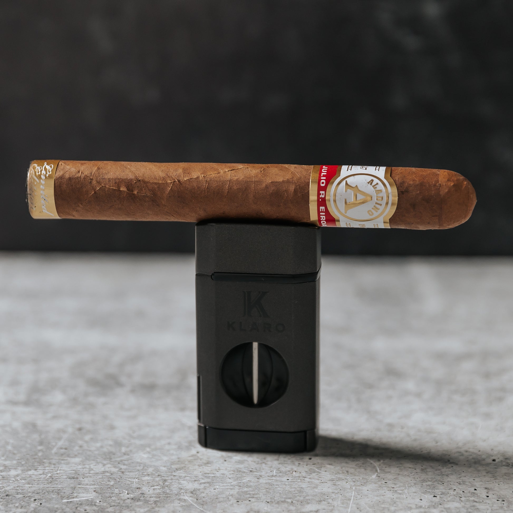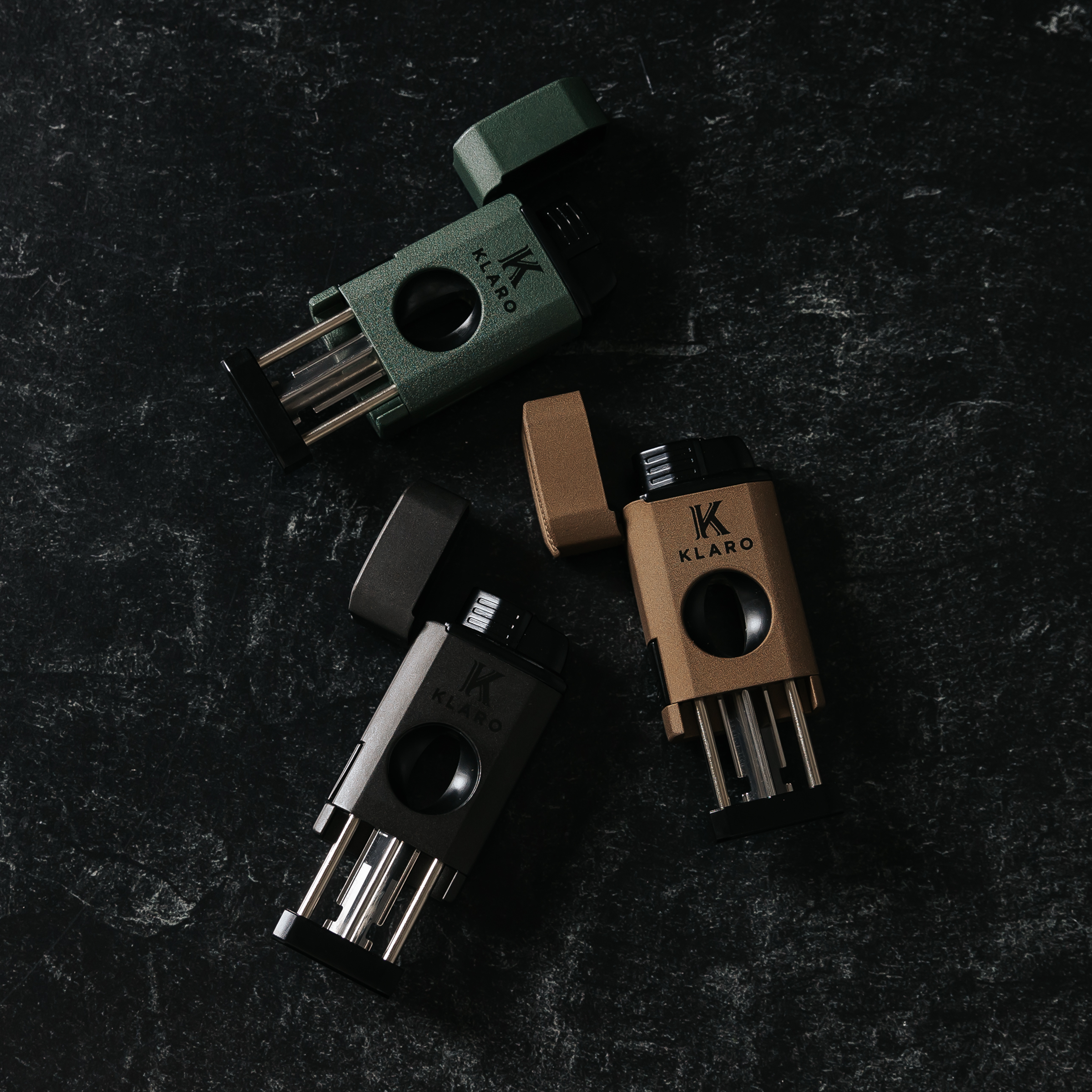Introducing the Klaro Overland Lighter & Cutter Series – your ultimate companion for a perfect cigar experience. Imagine lighting your cigar with a robust triple-jet flame that delivers an even burn every time, making each puff as satisfying as the last. No more carrying extra tools—the built-in, spring-loaded V-Cut gives you a precise, clean cut on demand, so you're always ready to enjoy your cigar. The heavy-duty flip-top lid doubles as a cigar stand for those moments when you're on the move, while the easy-turn flame adjuster lets you tailor the intensity to your liking. This lighter is built to keep up with its durable and stunning satin black metal finish and a premium silicone travel case to protect it from bumps and scrapes.