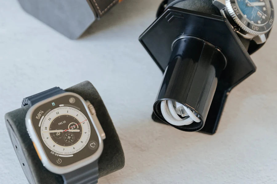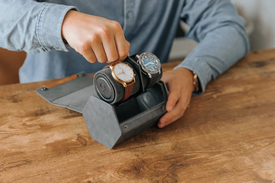 Die HEX-Uhrenrolle mit zwei Fächern präsentiert zwei Ihrer Lieblingsuhren in einem eleganten Etui aus veganem Leder mit einem weichen, dunkelgrauen Samtfutteral, das zur Eleganz Ihrer Uhren passt. Die HEX-Uhrenrolle verfügt über einen abnehmbaren Ständer, der ein Verrutschen und Rollen auf Reisen verhindert und es Ihnen ermöglicht, Ihre Uhren so zu präsentieren, wie sie sein sollten. Jedes Kissen ist mit einer abnehmbaren Kissenhülle ausgestattet, die für alle Uhrengrößen geeignet ist. Im Inneren des Ständers befindet sich ein verstecktes Staufach, das sich perfekt für zusätzliche Armbänder, ein Smartwatch-Ladegerät, ein Reinigungstuch, Manschettenknöpfe oder anderes Zubehör eignet. Stabile Druckknöpfe sorgen dafür, dass Ihre Uhren fest sitzen und die Mechanik der Uhr nicht beschädigt wird. Mit dieser sicheren Uhrenrolle von Case Elegance mit zwei Fächern können Sie Ihre Uhren im Handgepäck verstauen und so einen guten ersten Eindruck hinterlassen.