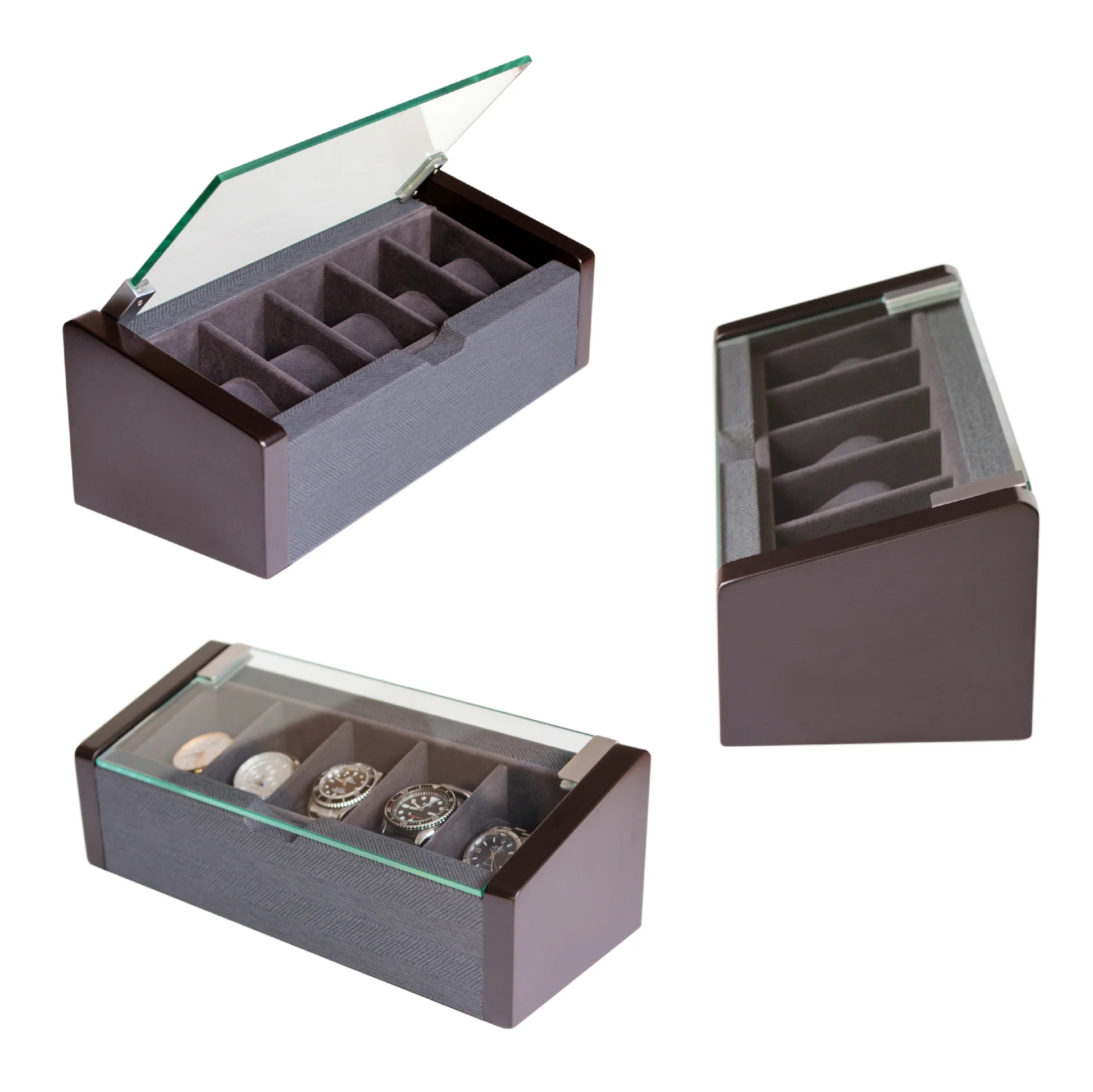 Dies ist die bisher eleganteste Uhrenbox von Case Elegance, die von oben bis unten aus hochwertigen Materialien gefertigt ist. Diese Uhrenbox mit fünf Schlitzen in Espresso-Optik und dicker Fischgrätstruktur wird selbst die eifrigsten Sammler beeindrucken.