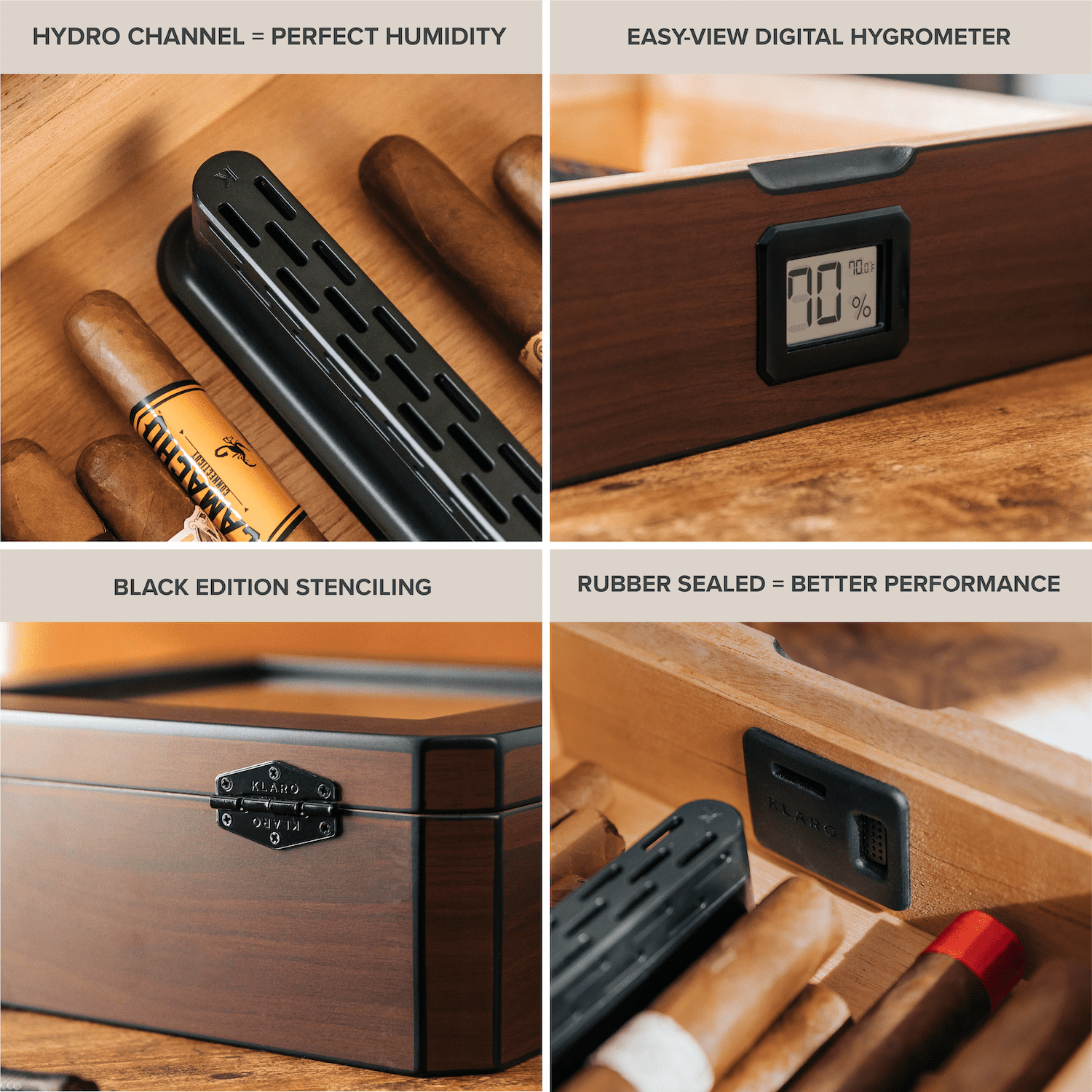 - Inklusive komplettem Hydro System ™ (Hydro Tray™ und zwei Flaschen Klaro Humidor Solution)