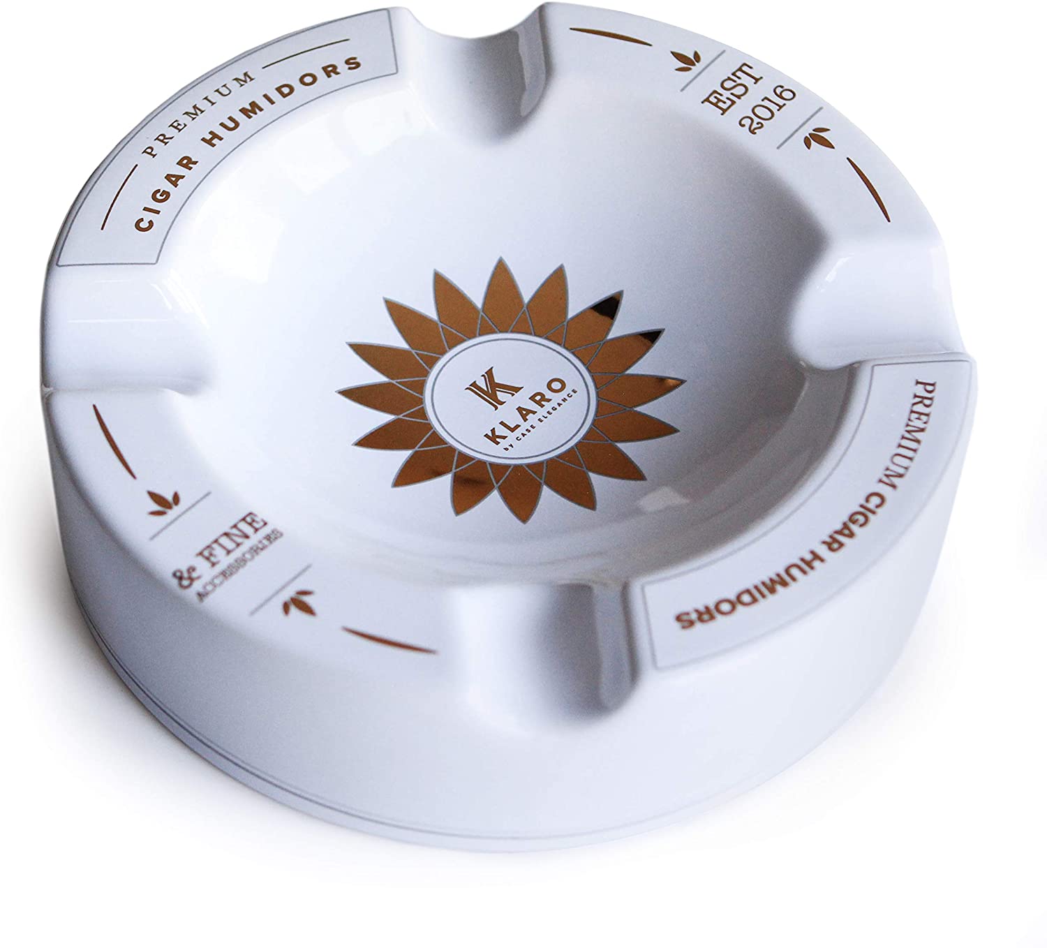 Wir stellen den Klaro Aschenbecher aus weißer und goldener Keramik vor. Dieser große Zigarrenaschenbecher ist das perfekte Accessoire für Ihre Terrasse, Ihr Büro oder Ihren Couchtisch und passt perfekt zu einem unserer Klaro Humidore.