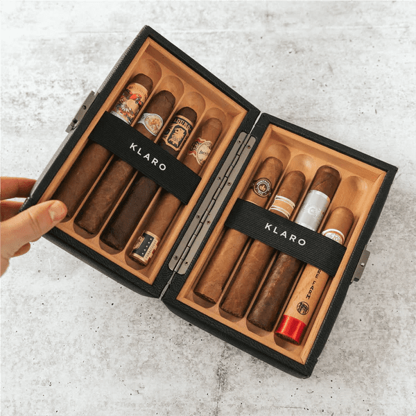 Das Maxwell Reise-Zigarrenetui ist ein unverzichtbares Zigarren-Accessoire, perfekt für alle, die unterwegs gerne ihre Lieblingszigarren genießen. Das strapazierfähige Hartschalenetui, das mit hochwertigem veganem Leder umwickelt ist, sorgt dafür, dass Ihre Zigarren während der Reise vor Schäden geschützt sind. Darüber hinaus bietet das Maxwell Etui Platz für bis zu 8 große Zigarren und hält sie mit einem Gummiband sicher an ihrem Platz. Das Innere ist mit luxuriösem spanischem Zedernholz ausgekleidet, das die perfekte Umgebung für die Bewahrung des Aromas und der Geschmacksnoten Ihrer kostbaren Zigarren bietet. Mit dem Maxwell Reisezigarrenetui als treuer Begleiter können Sie Ihre geschätzten Zigarren überallhin mitnehmen, wohin Ihre Reise geht.