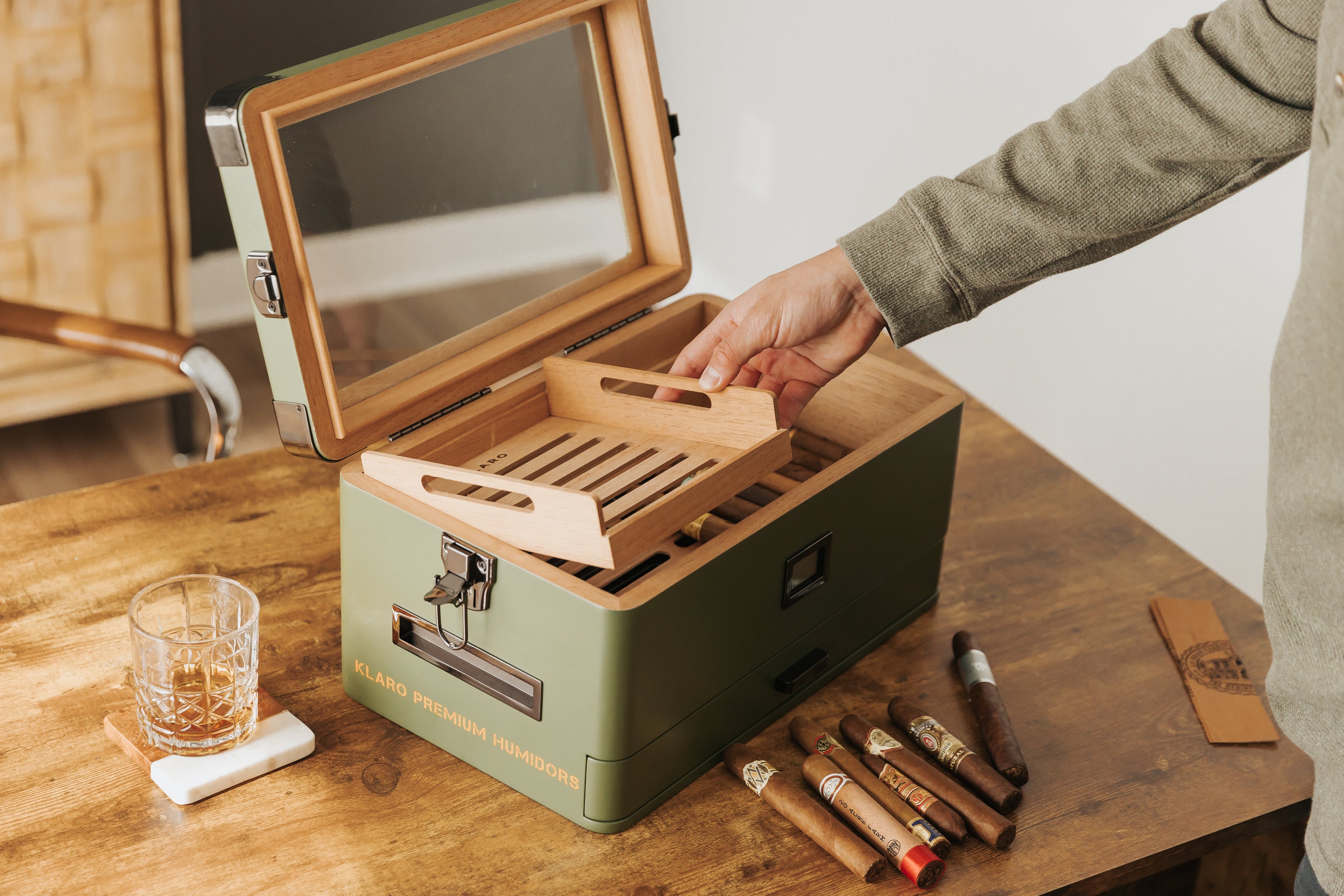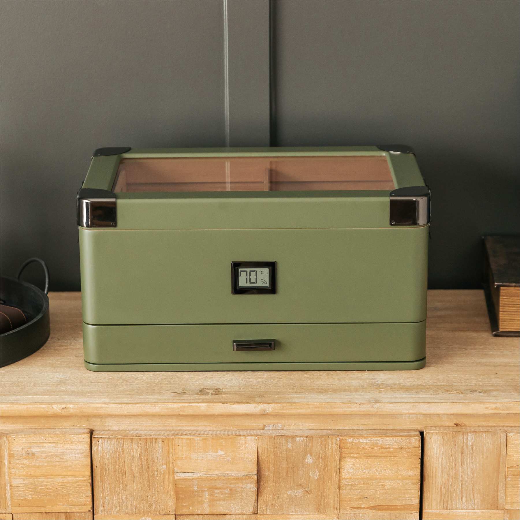 Crafted with tank-like durability and military aesthetics, the Military Glass Top Humidor boasts gunmetal protections and a specialty foam drawer for our Gunmetal Accessory Kit. Equipped with the Klaro Hydro System, it’s the premier choice for military enthusiasts, holding 50-100 cigars.