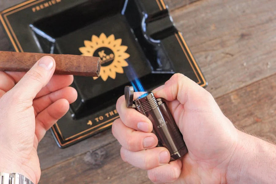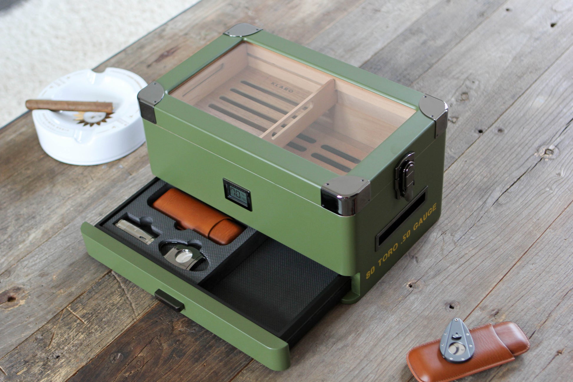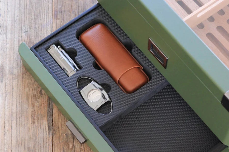 Se incluye un encendedor de triple antorcha a prueba de viento y un cortador de acero inoxidable de doble guillotina a juego. También se incluye un estuche de viaje semiduro que tiene un perfil bajo y ligero, lo que lo hace ideal para transportar sus puros. Hemos elaborado cuidadosamente el revestimiento metálico para que tenga un moderno acabado de bronce de cañón pulido que hará juego con su humidor militar. Aunque este kit de accesorios encaja cómodamente en cualquiera de nuestros cajones para humidores Klaro, ha sido diseñado específicamente para encajar en el nuevo cajón para humidores militares de espuma de Klaro. Es hora de elevar su experiencia de fumar puros con este kit de accesorios para puros de primera categoría.