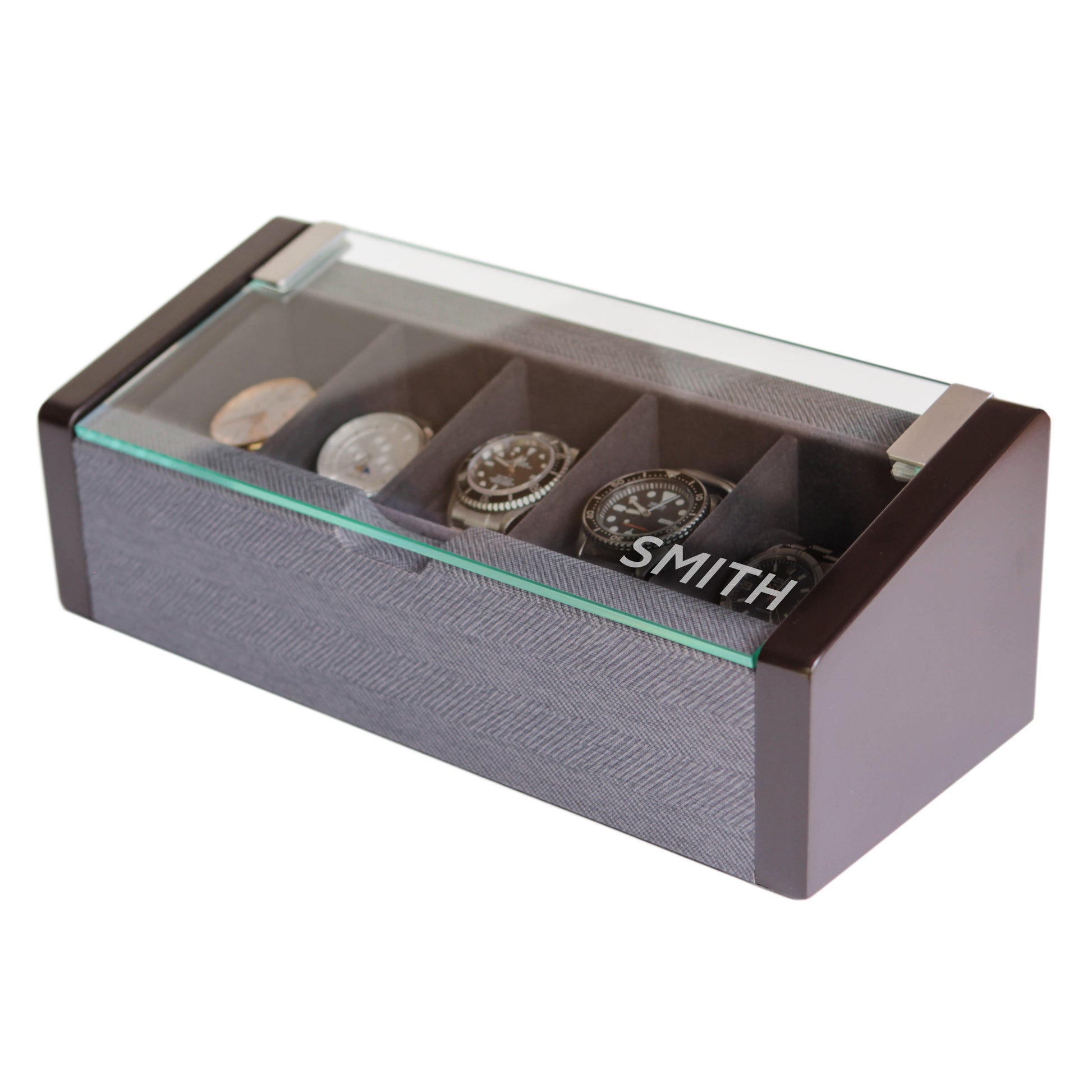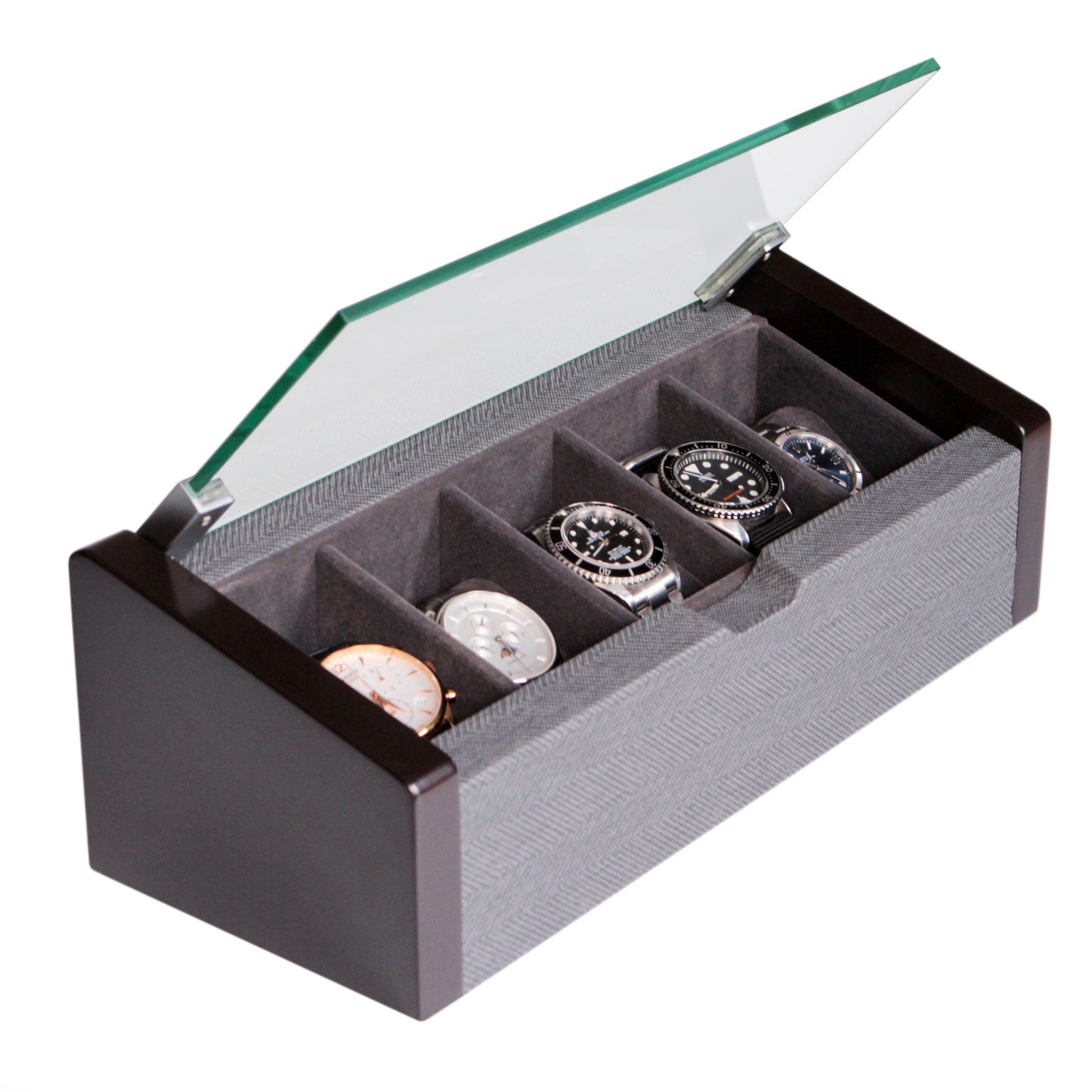 Esta es la caja para relojes más elegante de Case Elegance, hecha con materiales de primera calidad de arriba a abajo. Esta caja de reloj de cinco ranuras con acabado espresso y textura gruesa en espiga sorprenderá incluso a los coleccionistas más ávidos.