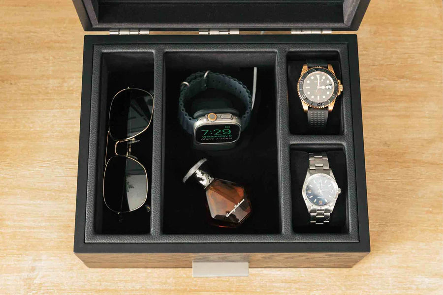 If you want to add your sunglasses, charge your phone, charge your Apple Watch, or store other daily items, no problem; remove the modular dividers to customize your watch box experience.