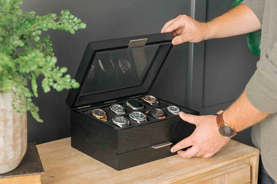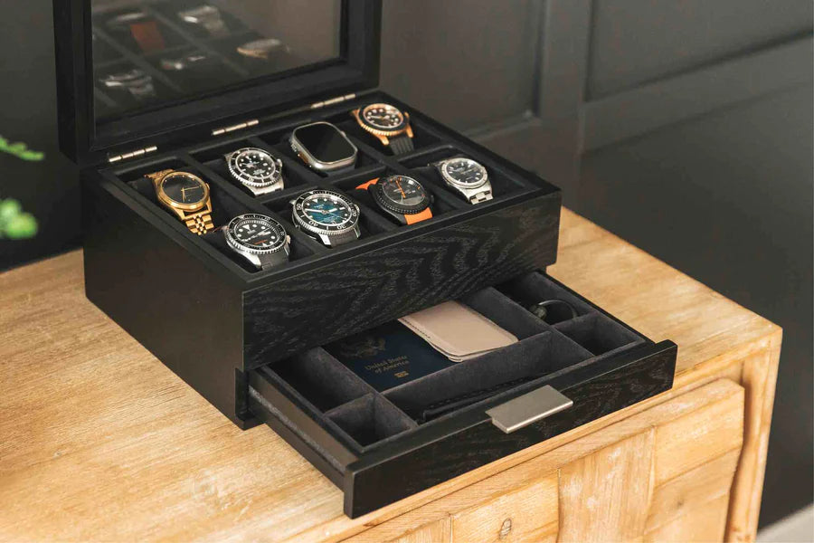 The Mill Watch Box is a versatile glass-top case for displaying up to 8 watches, featuring modular storage, scratch-proof velvet lining, and modular dividers. It also includes cushioned pillows for display, a drawer for accessories, and is smartwatch-ready, making it the total package for your watch collection.