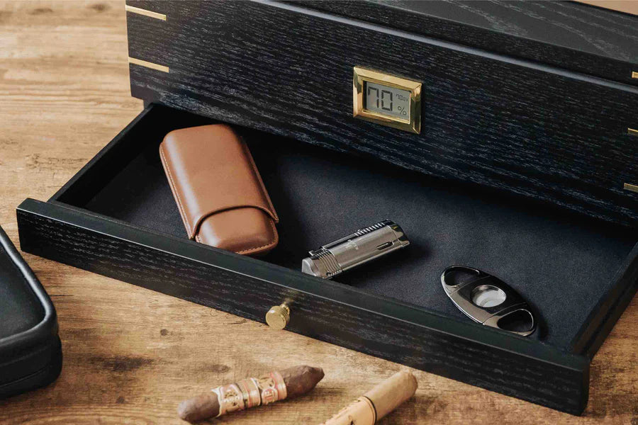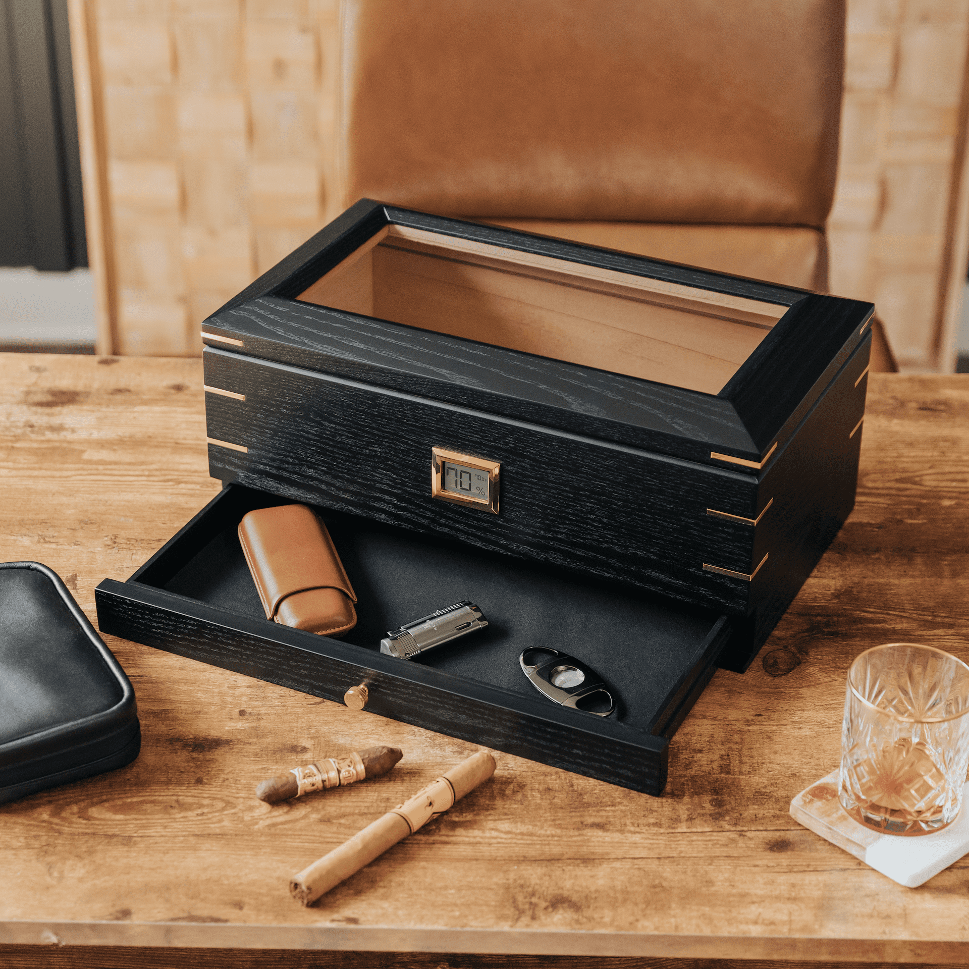 Perfeccionado para los verdaderos caballeros, el humidor Royal de Klaro es el mejor humidor de su clase. Con el lujo de la madera negra de primera calidad y las incrustaciones de metal dorado, este humidor será la pieza que tus puros se merecen. El Royal viene con todas las campanas y silbatos, incluyendo cedro español de 5 mm de espesor, juntas de alto rendimiento y un higrómetro que mide la humedad con precisión digital. Además, recibirá nuestro sistema Hydro, pendiente de patente, que ajusta la humedad entre el 65 y el 72%, asegurando que sus puros estén frescos y listos para fumar.