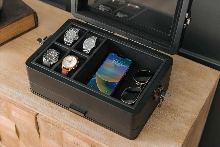 Muestre con orgullo sus relojes con Military Watch Box de Case Elegance, una hermosa vitrina con tapa de vidrio perfecta para su colección de relojes y accesorios. Esta caja de reloj de temática militar en negro mate cuenta con herrajes de bronce, que incluyen pestillos laterales, manijas, protectores de esquinas y paredes interiores removibles para un almacenamiento modular único. Puede almacenar 10 relojes de esfera grande o convertirlo en una configuración de 4 ranuras simplemente quitando las paredes interiores para acomodar gafas de sol y otros accesorios como su Apple Watch o teléfono. El interior está forrado con terciopelo negro suave y resistente a los arañazos para una máxima protección y divisores de cuero vegano duraderos para mantener sus relojes seguros. Muestre sus relojes correctamente sobre almohadas acolchadas individuales encima de nuestros soportes de almohadas diseñados a medida que garantizan que sus relojes estén perfectamente alineados. Hemos incluido un cajón de accesorios extraíble ideal para guardar correas de reloj, accesorios y herramientas adicionales. Con la capacidad de personalizar su configuración con carga de reloj inteligente y almacenamiento de gafas de sol, esta caja de reloj es la configuración todo en uno ideal para su colección de relojes. Como beneficio adicional, incluimos un soporte para Apple Watch que muestra tu Apple Watch mientras se carga.
