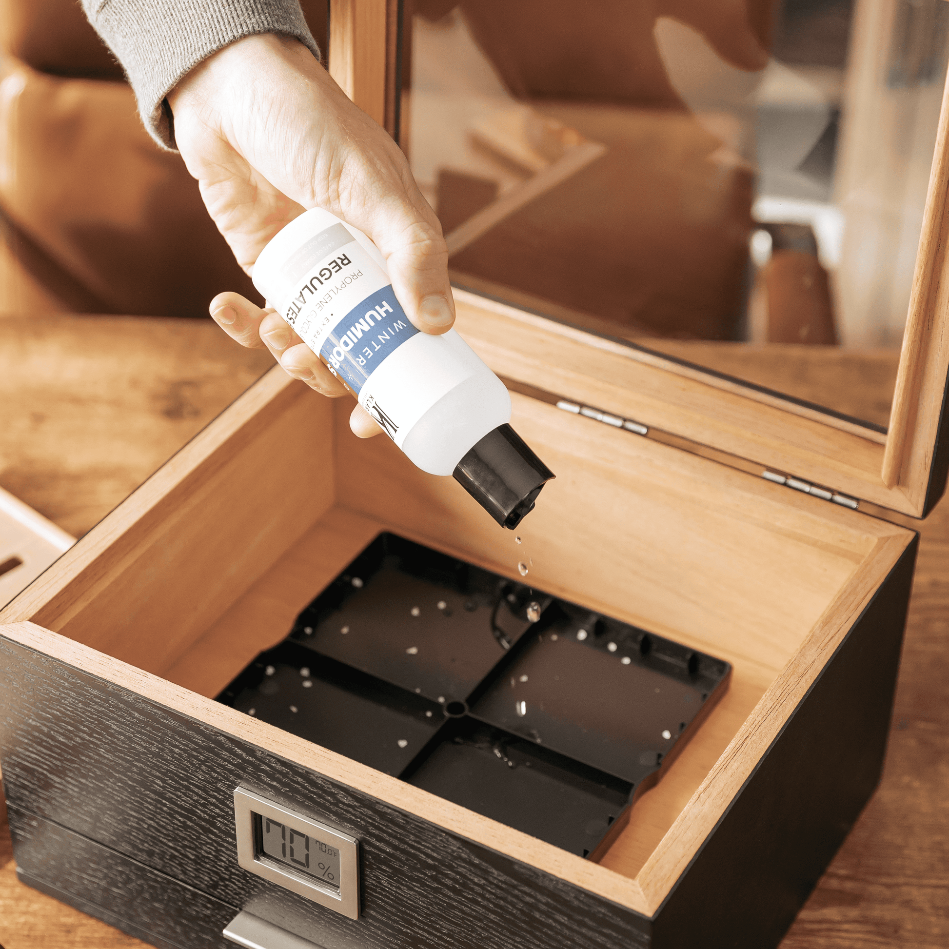 Nunca más te preocupes por quedarte sin solución de humidor. La Membresía Klaro automatiza la gestión de su humidor con una simple suscripción anual. También nos ocupamos de los elementos que se olvidan fácilmente, como una batería nueva para su higrómetro digital frontal. Esta suscripción llave en mano garantiza que su codiciada colección de barritas se mantenga perfectamente sazonada durante todo el año.