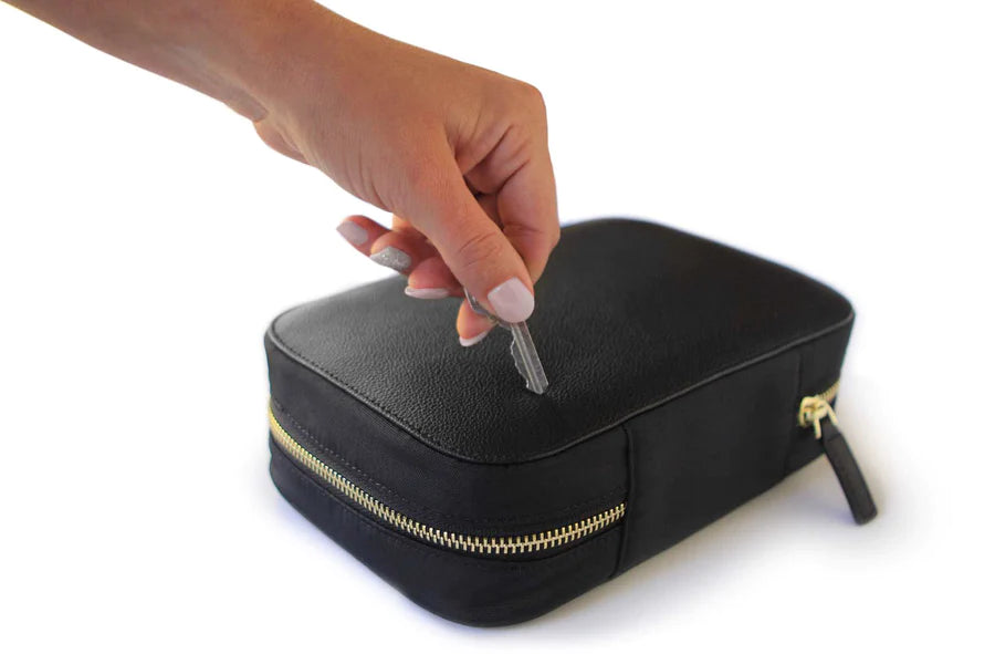 Este es el organizador de billetera de joyería grande más duradero y elegante que existe. Hemos añadido cuero DURA auténtico de plena flor, un cuero resistente a los arañazos, lo que lo convierte en el compañero perfecto para cualquier viajero. El tamaño grande le brinda espacio adicional para empacar sus piezas más importantes. ¿Estás de viaje pero tu bolso tiene espacio limitado? - Tome la bolsa de viaje con cremallera y clip, capaz de guardar relojes, pulseras, aretes más grandes y collares. Desde su diseño atemporal hasta su durabilidad, este organizador de joyas seguramente impresionará.