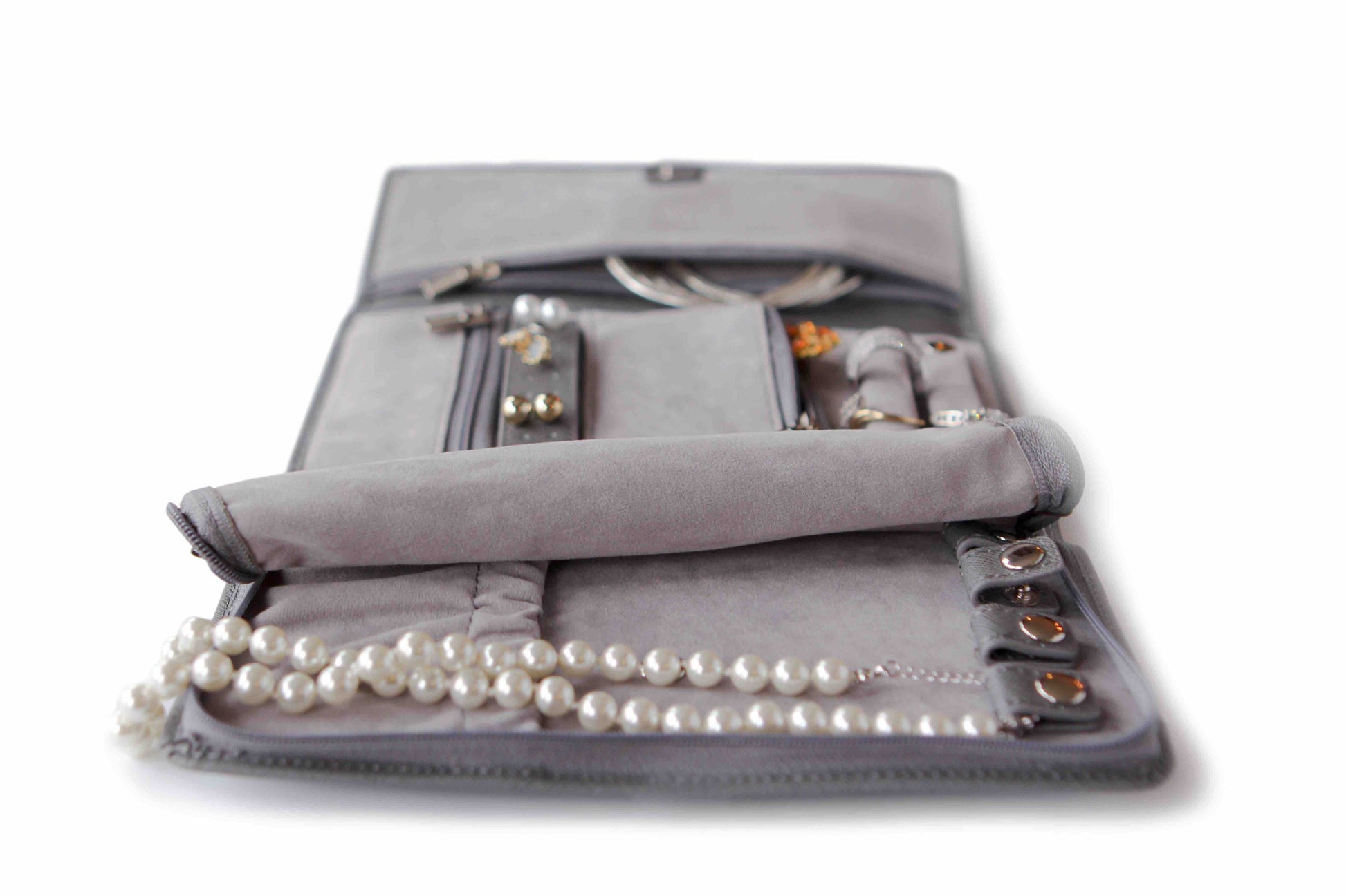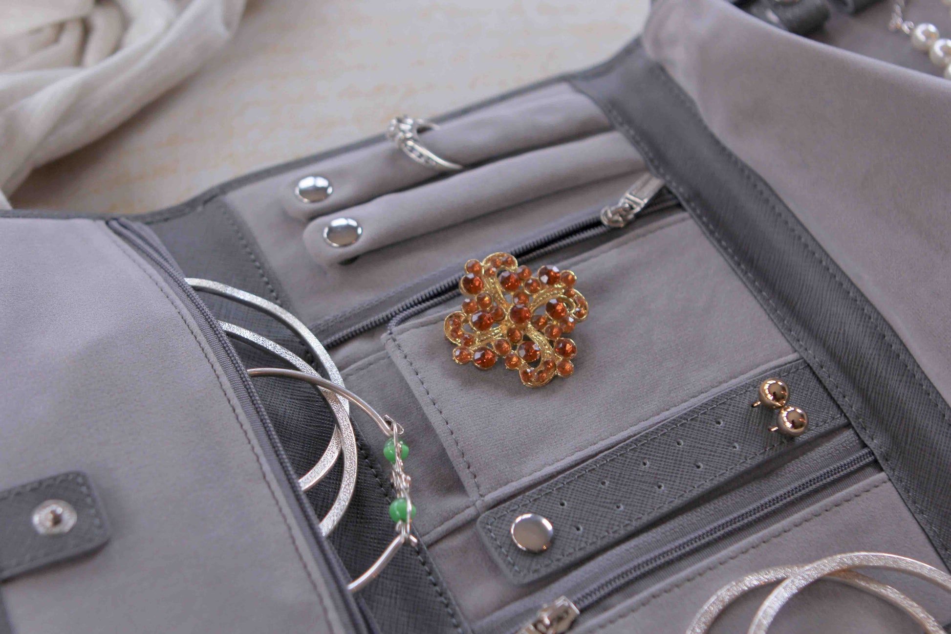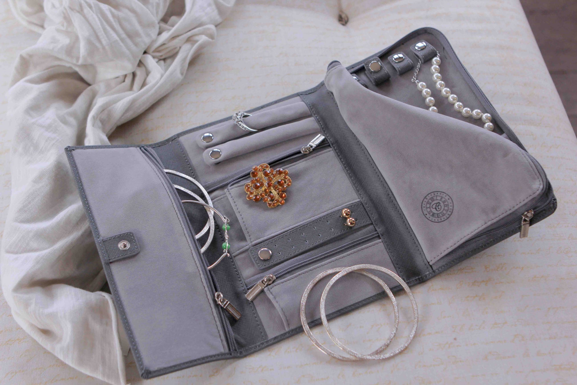 Questo è il più lussuoso portagioie da viaggio di medie dimensioni sul mercato. È costruito con vera pelle e un elegante rivestimento grigio Saffiano. Il rivestimento Saffiano è usato da marchi come Prada, Michael Kors e Chanel per dare ai prodotti in pelle una texture a chiazze incrociate, mentre serve anche per preservare e proteggere la pelle dall'acqua e dall'usura. Mai preoccuparsi di ottenere i vostri gioielli rubati nel vostro bagaglio registrato; semplicemente mettere questo caso nella vostra borsa o portare sulla borsa, e riposare facile. Questo organizzatore di gioielli da viaggio è perfetto per i gioielli di forma più piccola, ma può essere inadeguato per i gioielli più grandi.