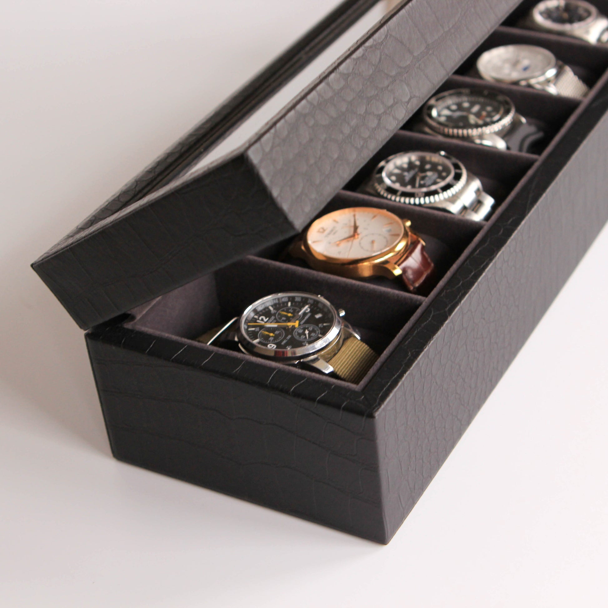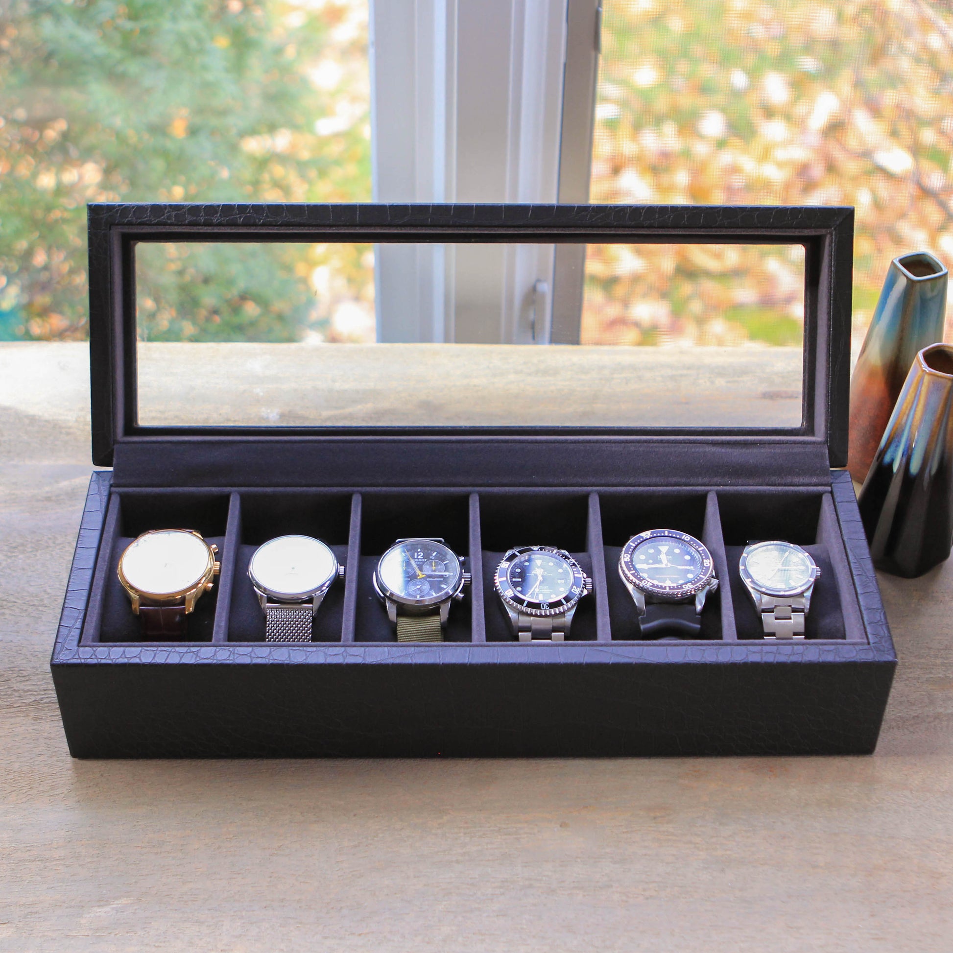 Finished with a luxurious and striking exterior made of black faux crocodile leather. Nestle up to six watches in the buttery-soft velvet interior and see your watches come to life.