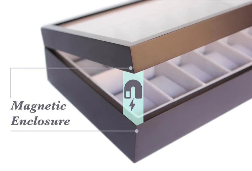 Qui a Case Elegance, abbiamo deciso di progettare la perfetta scatola per orologi utilizzando la costruzione in legno massiccio e incorporando elementi di design semplici e moderni. I magneti sono stati incorporati nel coperchio e sono finemente sintonizzati per aiutare a mantenere il coperchio chiuso e sicuro, mentre ti permettono anche di aprirlo facilmente. Non lasciate nessun orologio indietro con i nostri cuscini ultra-morbidi inclusi che si comprimono per adattarsi a diverse dimensioni e tipi di orologi. Conserva e mostra i tuoi orologi come si deve con questa scatola di legno per orologi.
