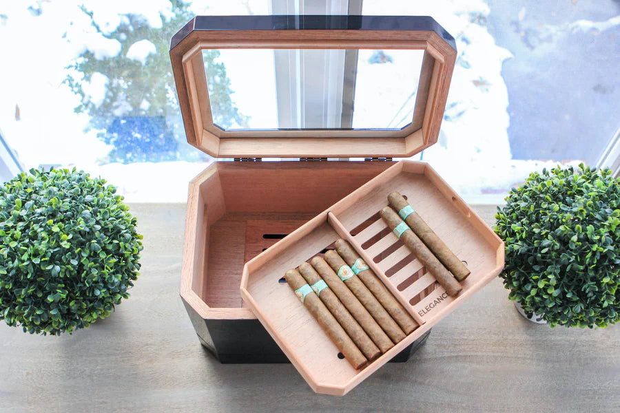 Presentamos el humidor Octodor Glass Top de Klaro. Hemos pasado años elaborando meticulosamente este humidor para que sea el mejor hasta ahora. Se ha sometido a exhaustivas investigaciones, pruebas y comentarios de los clientes para resolver todas las deficiencias que se experimentan comúnmente con otros humidores. Inteligentemente empotrado en la base se encuentra el Hydro System incluido, pendiente de patente, un sistema de humidificación de cigarros preciso y de bajo mantenimiento que facilita el mantenimiento de su humidor. Este humidor de lujo presenta una llamativa silueta octogonal, un elegante acabado en piano negro, tapa de vidrio, higrómetro digital frontal, cajón de almacenamiento de accesorios, cedro español y una carcasa magnética hermética. Le brindamos todo lo que necesita para comenzar a usar su nuevo Octodor, incluido el Hydro System, pendiente de patente, que contiene dos botellas de solución humidificadora para ayudarlo a comenzar con su condimento. Este es el humidor de cigarros más completo que existe. Una silueta llamativa y una ingeniería bien pensada lo convierten en un humidor imprescindible para cualquier aficionado.