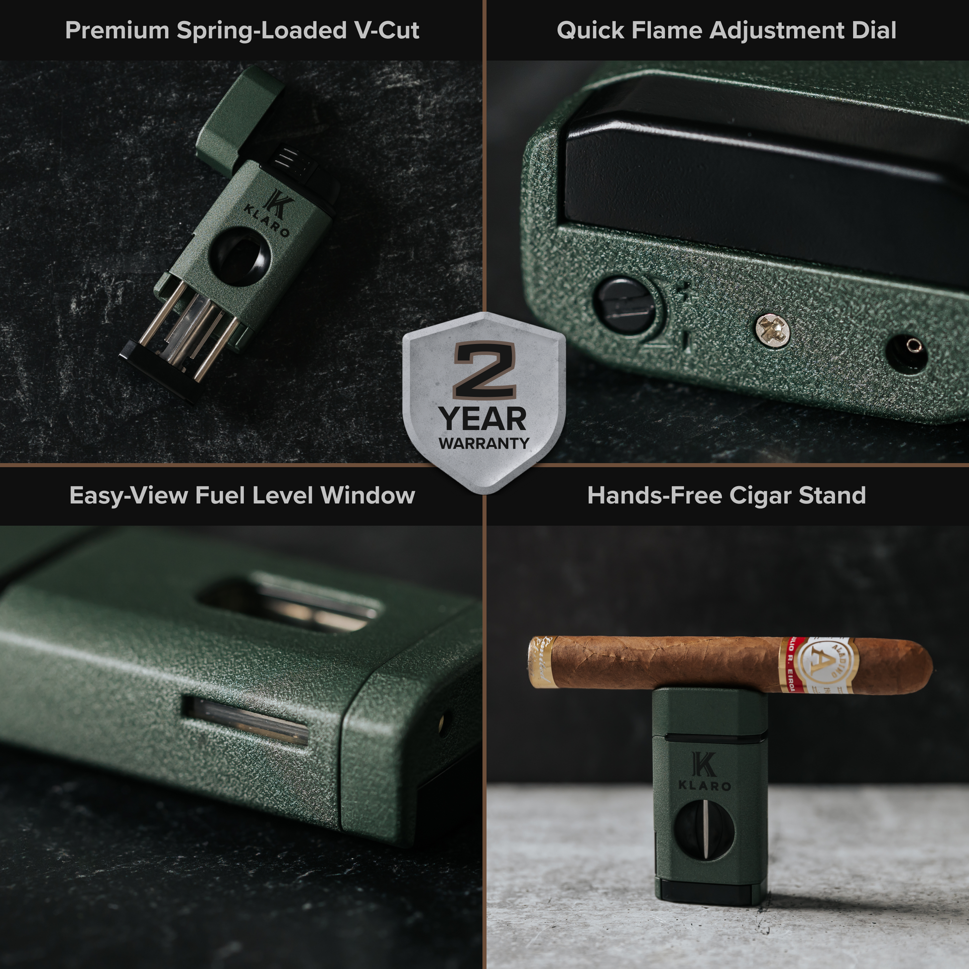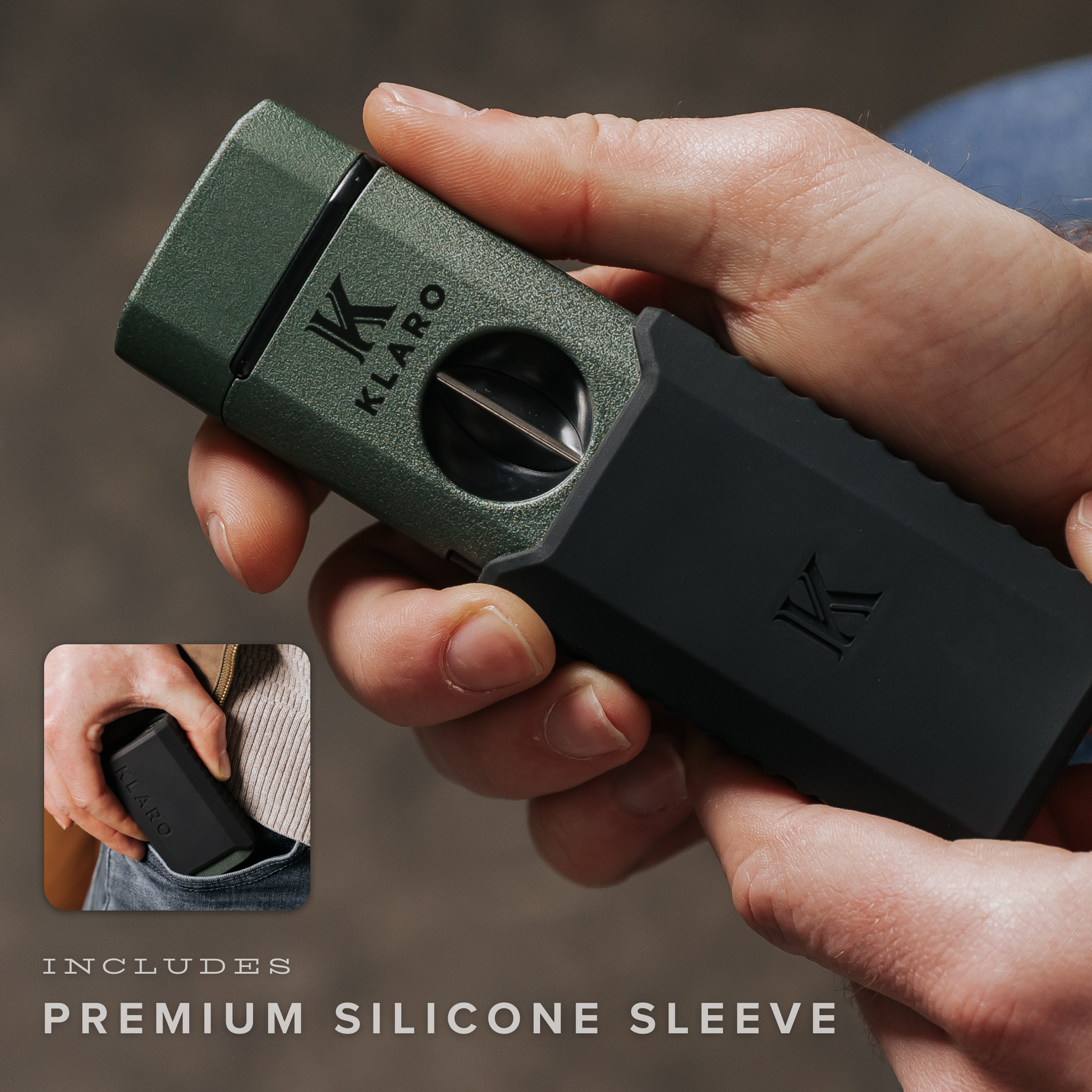Introducing the Klaro Overland Lighter & Cutter Series – your ultimate companion for a perfect cigar experience. Imagine lighting your cigar with a robust triple-jet flame that delivers an even burn every time, making each puff as satisfying as the last. No more carrying extra tools—the built-in, spring-loaded V-Cut gives you a precise, clean cut on demand, so you're always ready to enjoy your cigar. The heavy-duty flip-top lid doubles as a cigar stand for those moments when you're on the move, while the easy-turn flame adjuster lets you tailor the intensity to your liking. This lighter is built to keep up with its durable and stunning green powder-coated finish and a premium silicone travel case to protect it from bumps and scrapes.