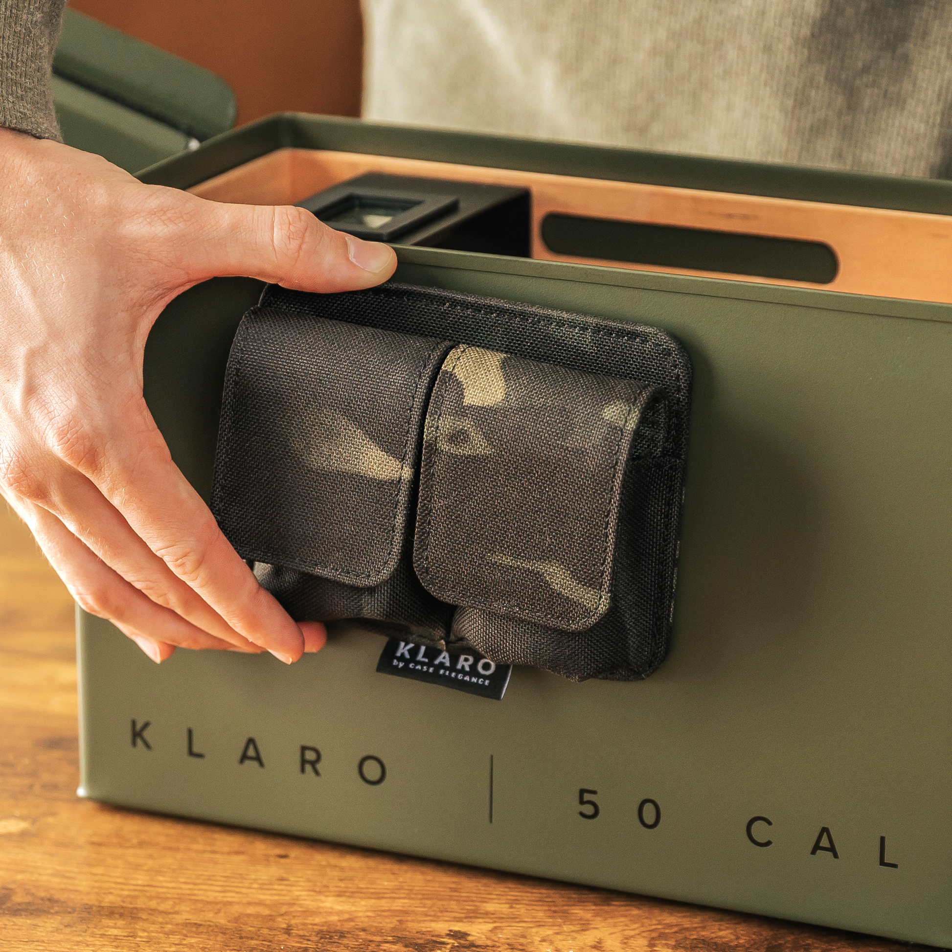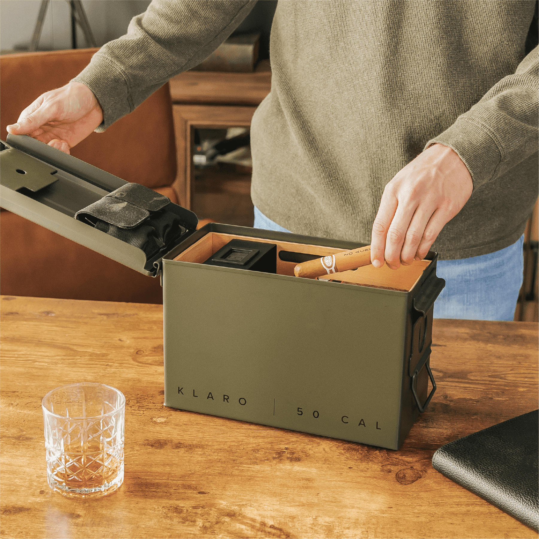 Presentamos 'The Smoke Can', un humidificador de cigarros con un toque diferente: está hecho de una lata de munición M2A1 real, lo que le da un toque resistente de inspiración militar. Esto no es sólo un humidor; es una fortaleza para sus puros, completa con controles de humedad inteligentemente ocultos debajo de sus bandejas de cedro español y un higrómetro digital de primer nivel para una gestión climática precisa. El cedro no solo tiene un buen aspecto sino que también mantiene sus puros en condiciones ideales, mientras que el soporte magnético para accesorios en nailon balístico Multicam oscuro garantiza que sus herramientas estén siempre a mano. Compacto y listo para la acción, es perfecto para el fumador aventurero que disfruta de un toque de encanto robusto en su lugar para guardar puros.