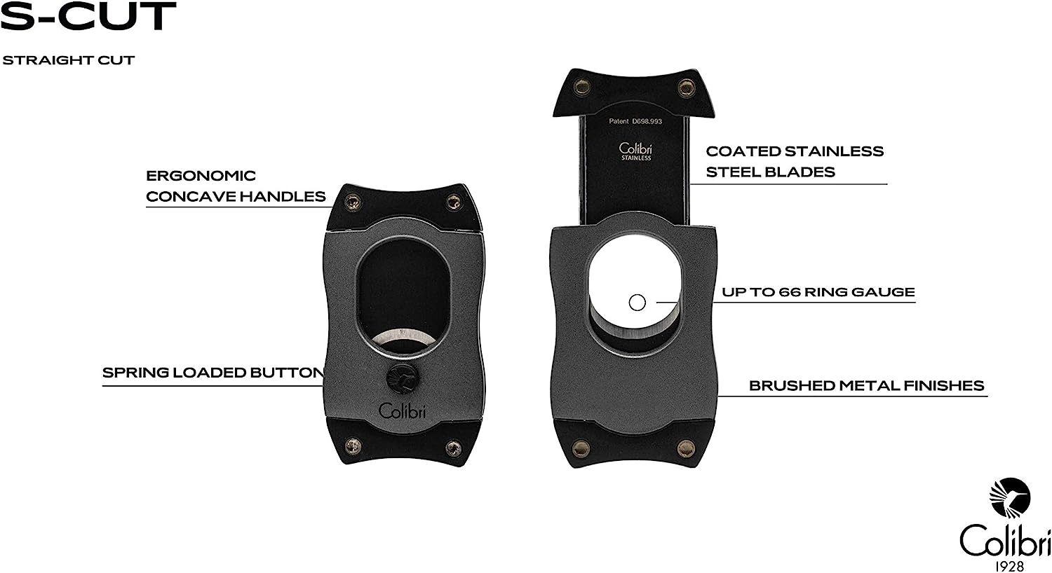 The S-Cut is everything you love about the V-Cut—in a straight cut. The Colibri S-Cut is contoured for beauty and to fit securely in your hand. The primary stainless steel blade is spring-loaded and is purposefully designed to meet the secondary blade with almost no space between the two blades to produce a crisp shear off the cap of your cigar.