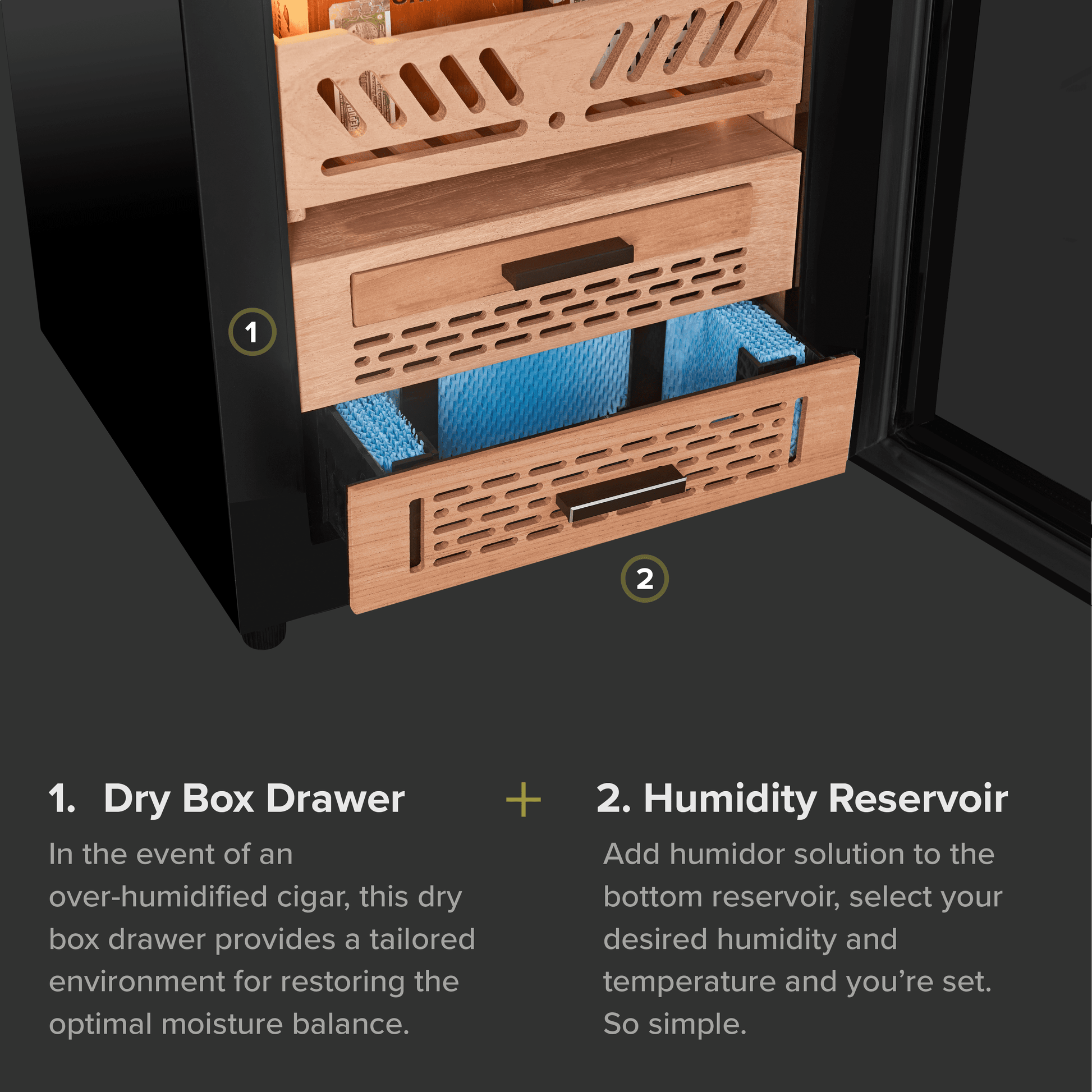 Introducing the Airo Fridgador (288 liters) - a deluxe fridge-inspired humidor designed to perfectly preserve up to 1,700 cigars. Equipped with a modern active humidity control system, it meticulously maintains ideal conditions, ensuring consistent humidity and freshness throughout with its integrated circulation fans and humidor solution reservoir. Temperature is streamlined and constant thanks to its compressor. Compressors are far more accurate and reliable compared to thermoelectric units. The sleek design features digital co