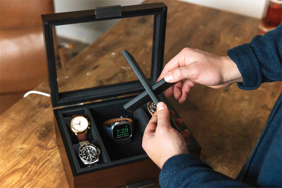 If you want to add your sunglasses, charge your phone, charge your Apple Watch, or store other daily items, no problem; remove the modular dividers to customize your watch box experience.