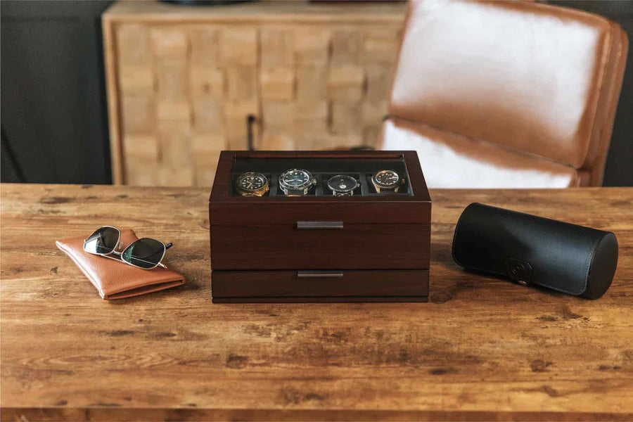 The Mill Watch Box is a versatile glass-top case for displaying up to 8 watches, featuring modular storage, scratch-proof velvet lining, and modular dividers. It also includes cushioned pillows for display, a drawer for accessories, and is smartwatch-ready, making it the total package for your watch collection.