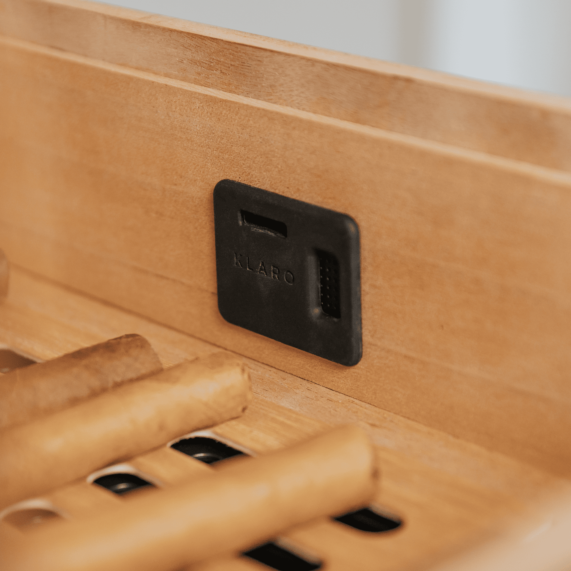 Perfetto per i veri gentiluomini, l'Humidor Royal di Klaro è un humidor di prim'ordine. Con il suo lusso, il legno di frassino nero pregiato e l'intarsio in metallo dorato, questo humidor sarà sicuramente il pezzo forte che i vostri sigari meritano. Il Royal è dotato di tutti i comfort, tra cui un cedro spagnolo spesso 5 mm, guarnizioni ad alte prestazioni e un igrometro che misura l'umidità con precisione digitale. Inoltre, riceverete il nostro sistema Hydro, in attesa di brevetto, che regola l'umidità tra il 65 e il 72%, assicurando che i vostri sigari siano freschi e pronti da fumare.
