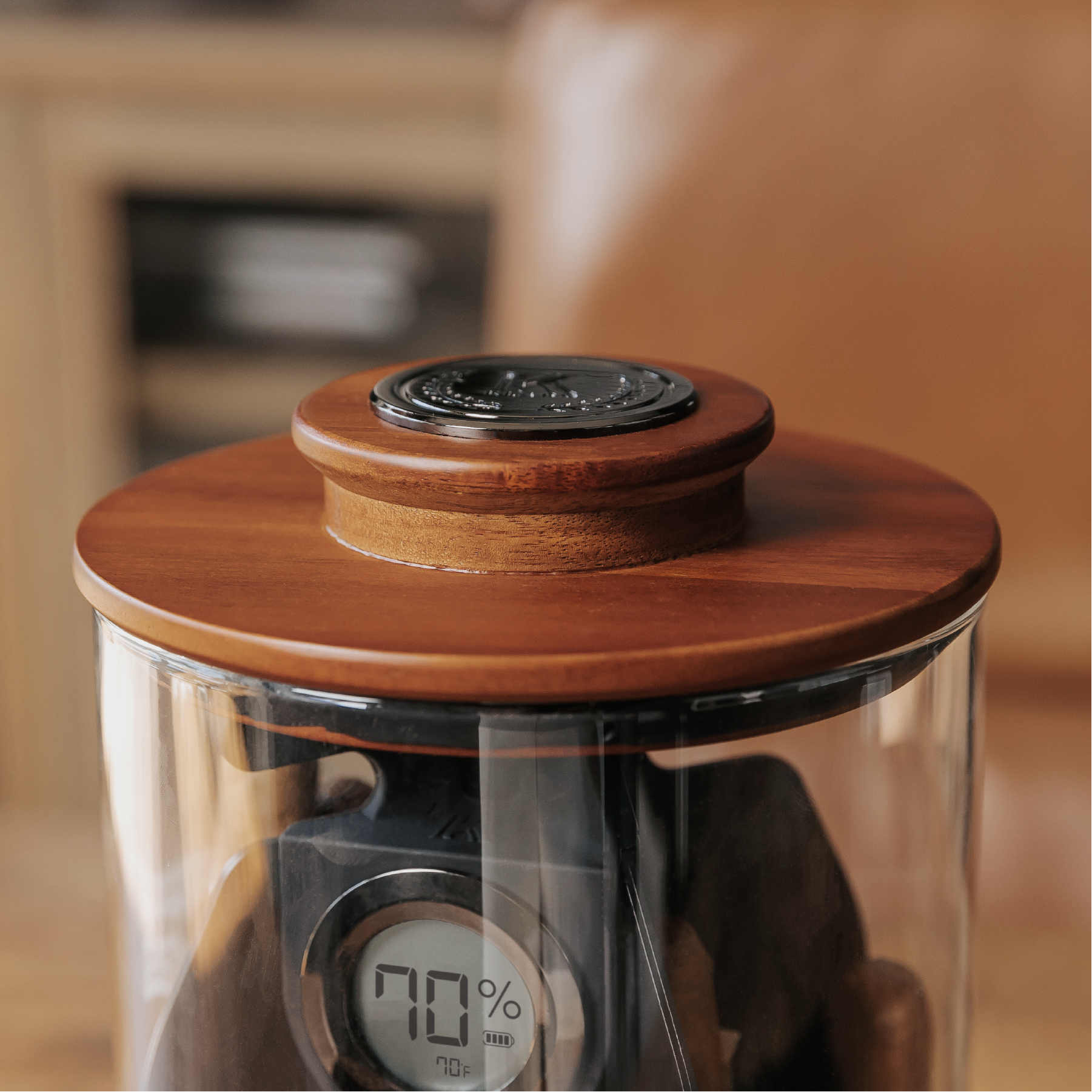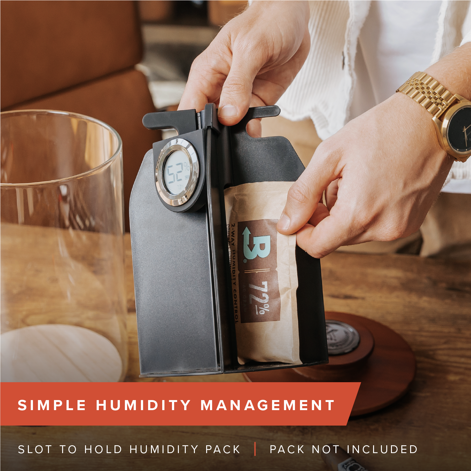El Cylindor cuenta con una elegante tapa de acacia que sella la humedad, coronada con un higrómetro digital para una precisión en la que puede confiar.