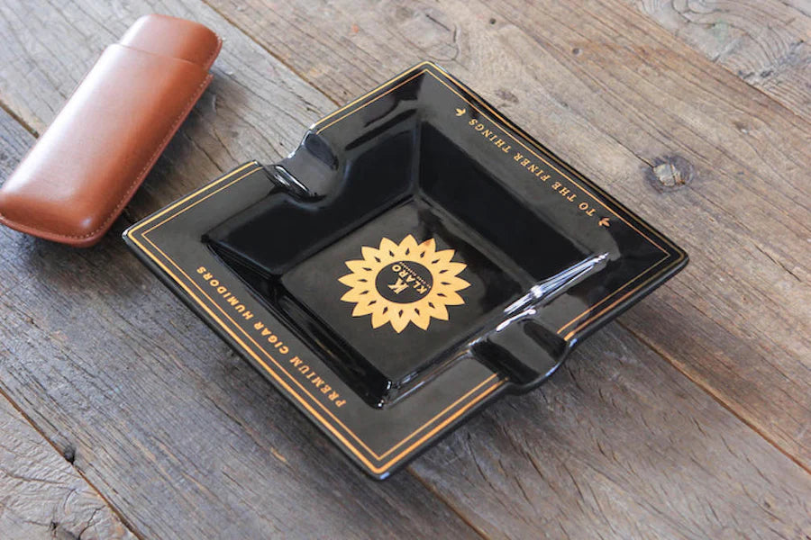 Se lee en el fondo de este cenicero de cerámica negra. Esta frase es un brindis por la cultura del cigarro y lo que representa. El acabado de las letras es una preciosa lámina dorada.