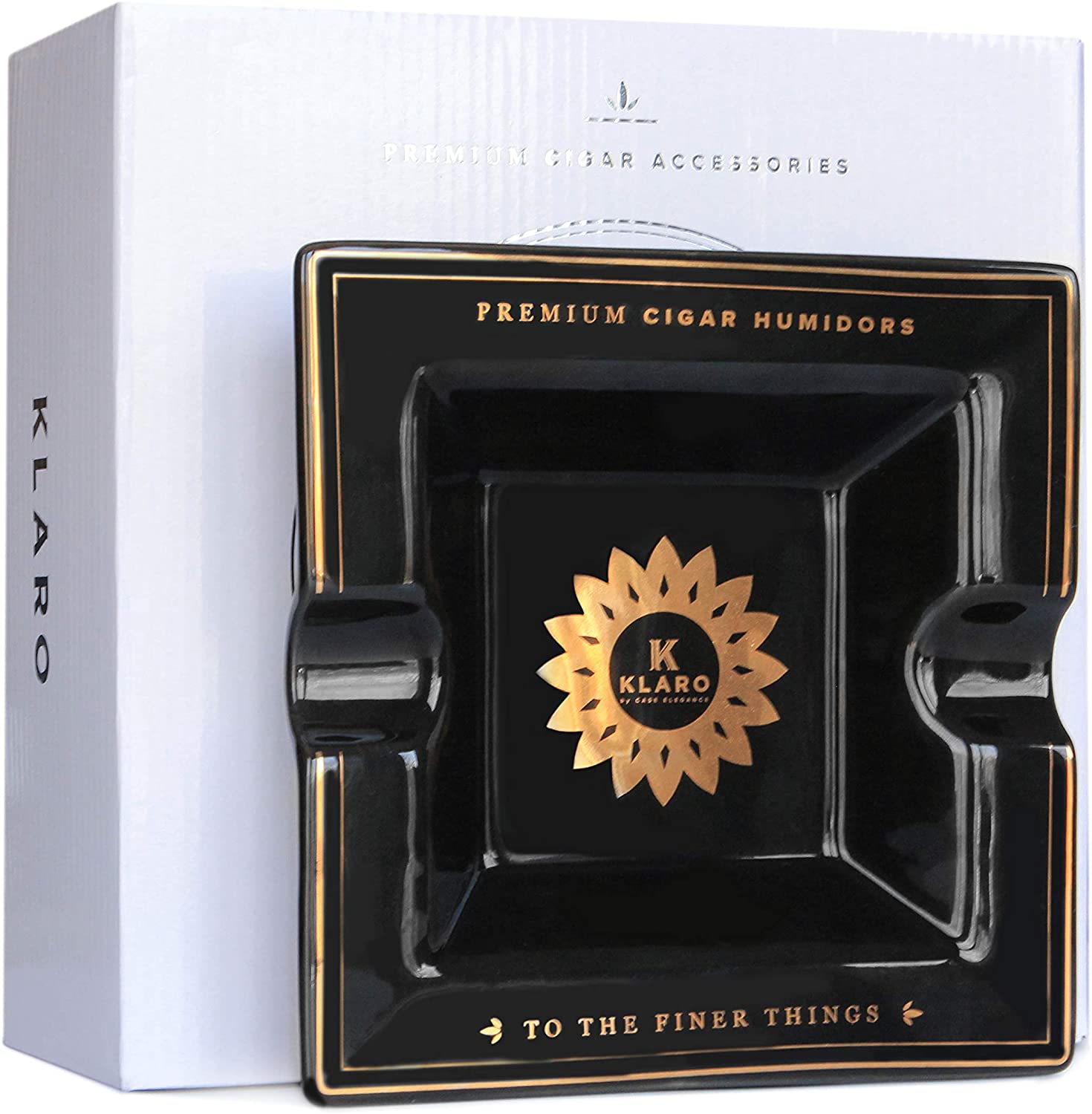 Un impresionante acabado en negro brillante, un diseño decorativo minimalista y una silueta cuadrada complementarán cualquier espacio habitable. El diseño dorado principal alrededor del logotipo de Klaro se asemeja a hojas de cigarro, mientras que en la parte inferior se lee "a las cosas más finas", que abarca cómo te sientes al disfrutar de un cigarro. Este cenicero combinará perfectamente con cualquier modelo de humidores Klaro.