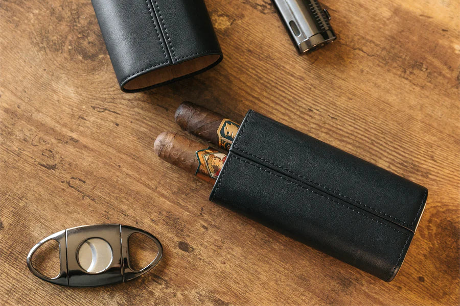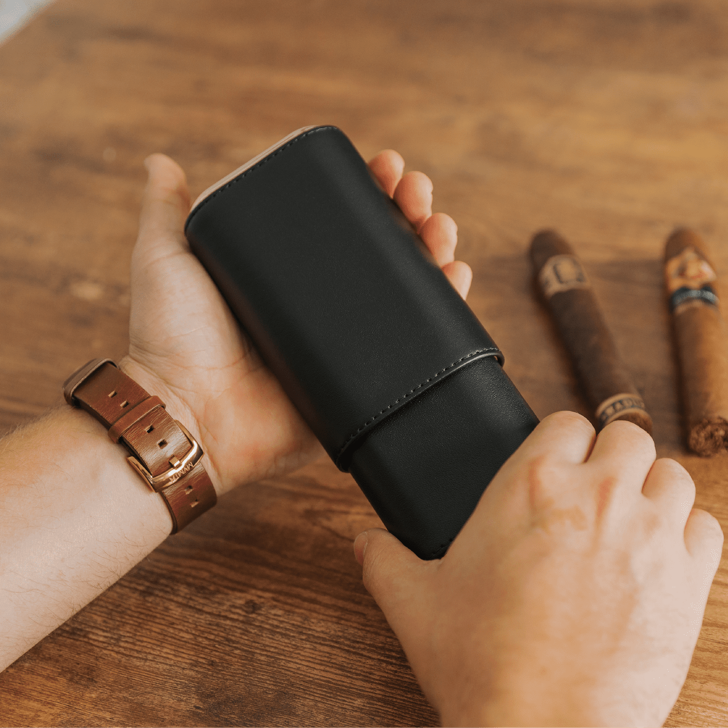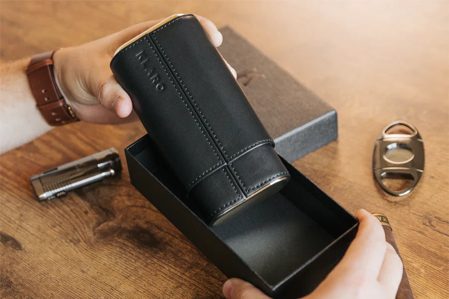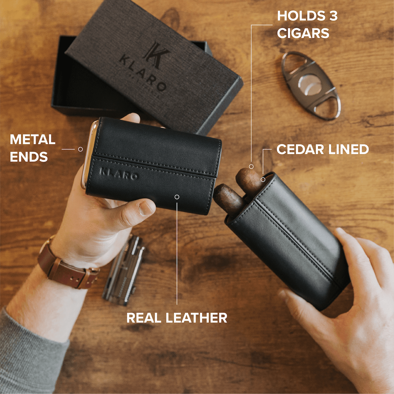 Mantenga sus cigarros favoritos seguros donde quiera que viaje con el estuche de viaje de cuero para tres cigarros Klaro. Este lujoso estuche de viaje cuenta con un interior forrado de cedro español que ayuda a mantener fresco su cigarro y está hecho con cuero genuino que se puede oler al sacarlo de la caja. Este estuche humidificador listo para viajar facilita el transporte de puros de calibre de hasta 60 anillos, lo que significa que ya no tendrá que dejar los favoritos más grandes en casa. Incluye extremos de bronce pulido para mayor lujo y protección, con costuras supremas en cada borde. Personalice su estuche con iniciales, lo que lo convierte en el mejor regalo para los amantes de los cigarros.