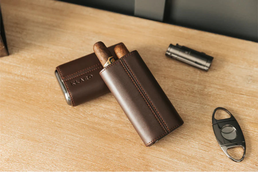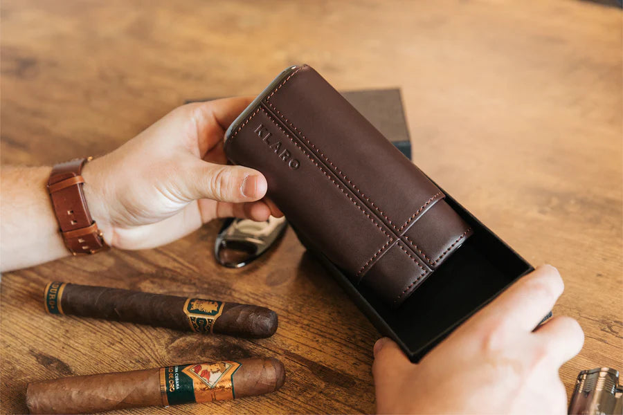 Mantenga sus cigarros favoritos seguros donde quiera que viaje con el estuche de viaje de cuero para tres cigarros Klaro. Este lujoso estuche de viaje cuenta con un interior forrado de cedro español que ayuda a mantener fresco su cigarro y está hecho con cuero genuino que se puede oler al sacarlo de la caja. Este estuche humidificador listo para viajar facilita el transporte de puros de calibre de hasta 60 anillos, lo que significa que ya no tendrá que dejar los favoritos más grandes en casa. Incluye extremos de bronce pulido para mayor lujo y protección, con costuras supremas en cada borde. Personalice su estuche con iniciales, lo que lo convierte en el mejor regalo para los amantes de los cigarros.