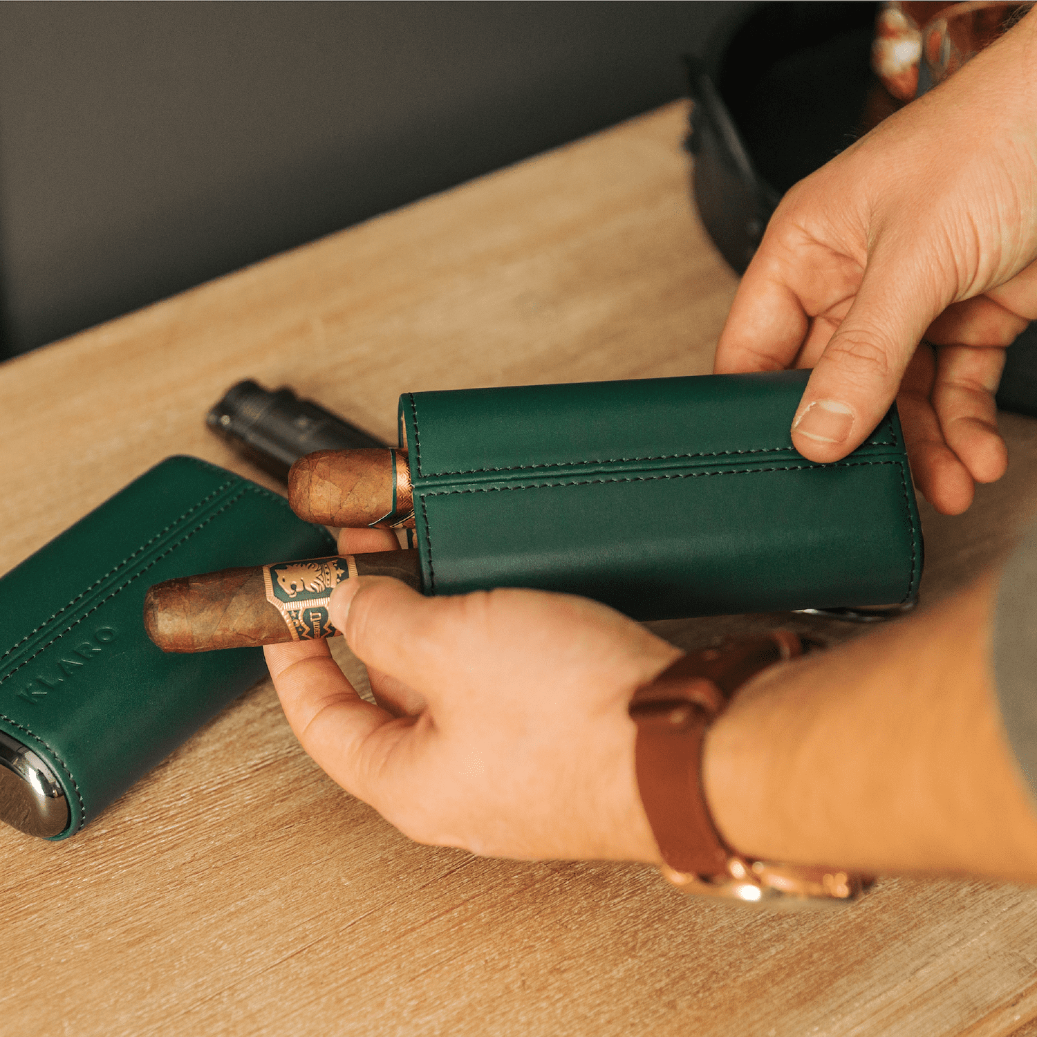 Mantenga sus cigarros favoritos seguros donde quiera que viaje con el estuche de viaje de cuero para tres cigarros Klaro. Este lujoso estuche de viaje cuenta con un interior forrado de cedro español que ayuda a mantener fresco su cigarro y está hecho con cuero genuino que se puede oler al sacarlo de la caja. Este estuche humidificador listo para viajar facilita el transporte de puros de calibre de hasta 60 anillos, lo que significa que ya no tendrá que dejar los favoritos más grandes en casa. Incluye extremos de bronce pulido para mayor lujo y protección, con costuras supremas en cada borde. Personalice su estuche con iniciales, lo que lo convierte en el mejor regalo para los amantes de los cigarros.