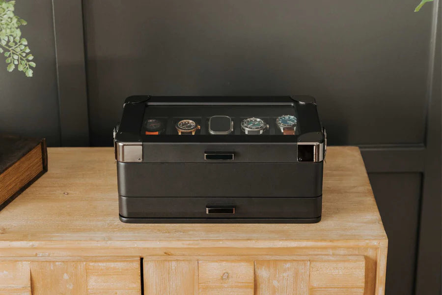 The Military Watch Box by Case Elegance, celebrated by collectors, offers a top-tier glass-top case and modular storage for 10 watches, with a scratch-resistant velvet interior and an accessory drawer. Expertly crafted with premium materials, it includes an apple watch stand, fulfilling all watch storage needs with elegance.