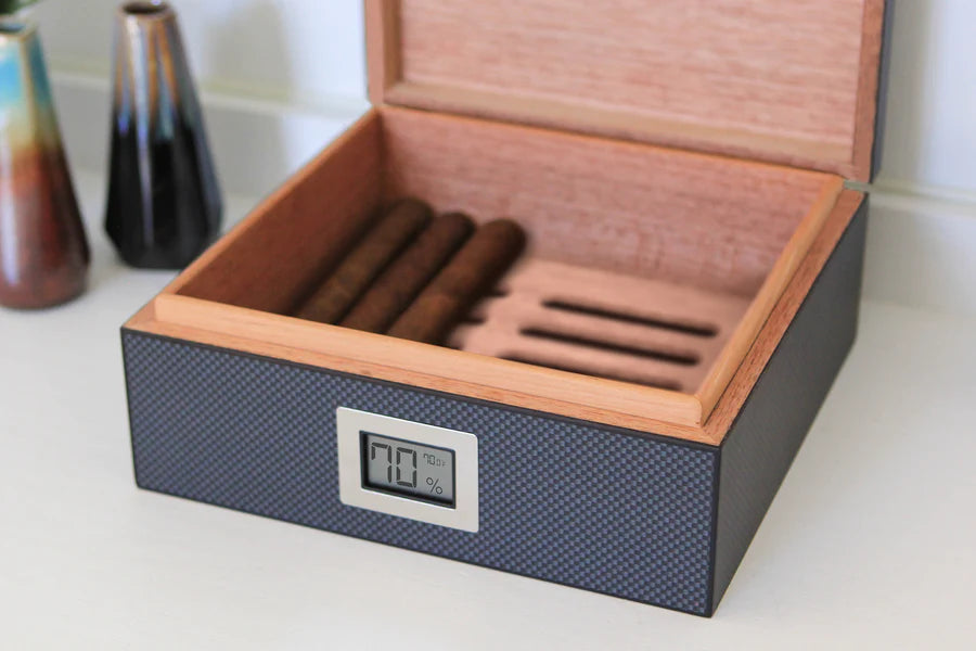 The Kingston humidor is a no-fuss humidor setup. Boasting a sporty carbon fiber finish, robust Spanish cedar lining, and a digital hygrometer, the Kingston is safe bet for any cigar enthusiast.