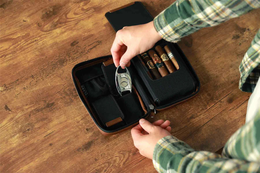The Flint brown Italian leather cigar travel case is on a level of its own, incorporating top-notch materials with a more thoughtful layout. We achieved a traditional leather soft-good design that effectively protects your cigars when traveling by adding a custom-engineered (patent-pending) protective plastic hard-shell that inconspicuously sits inside a nylon sleeve. Other details like the elongated magnet pockets that allow various sizes of accessories to fit comfortably, the interior leather piping and leather accents, the custom polished gunmetal zipper, and the high-quality materials were all meticulously chosen and designed. Any aficionado will be glad they added this beautiful piece to their collection, whether this is a gift or for yourself.