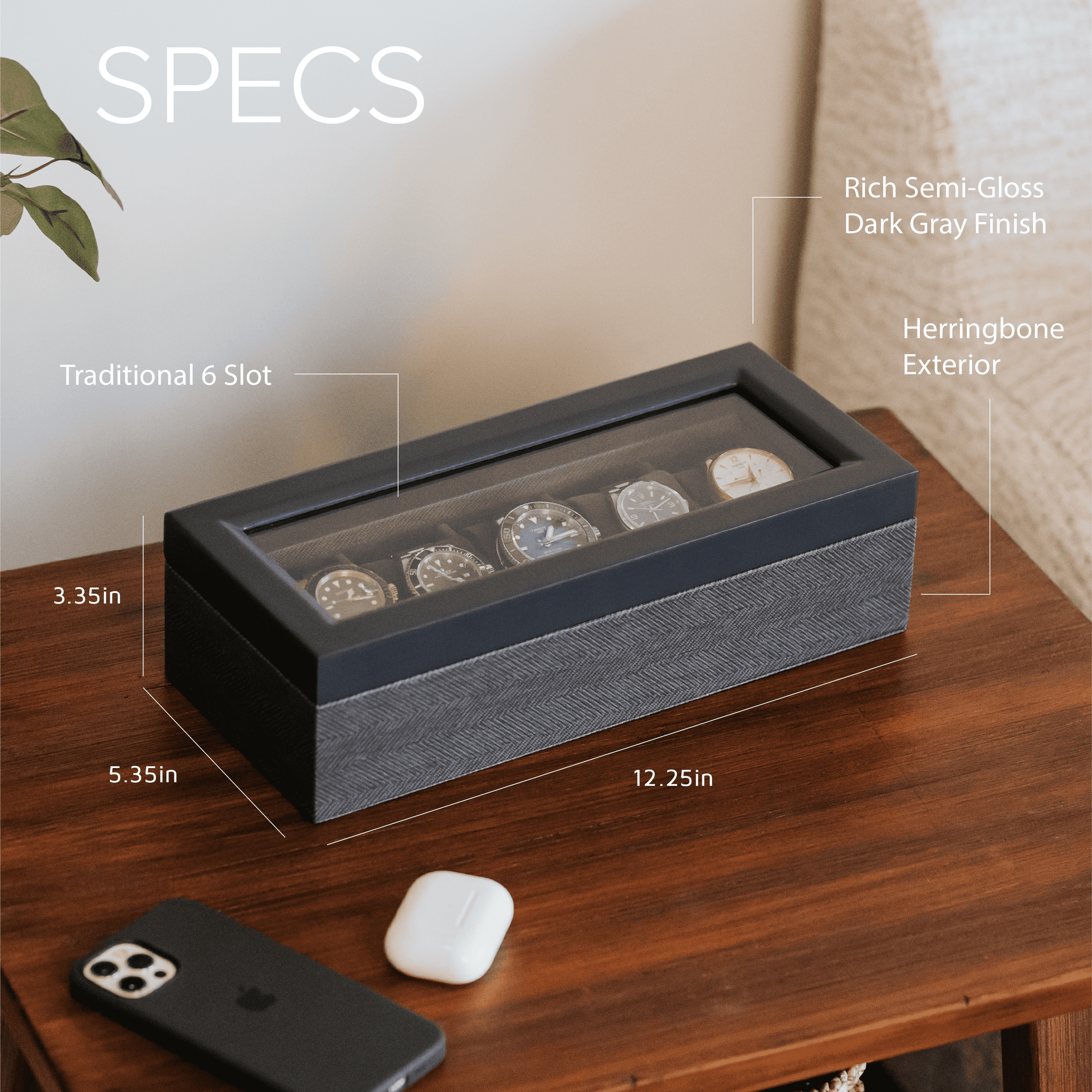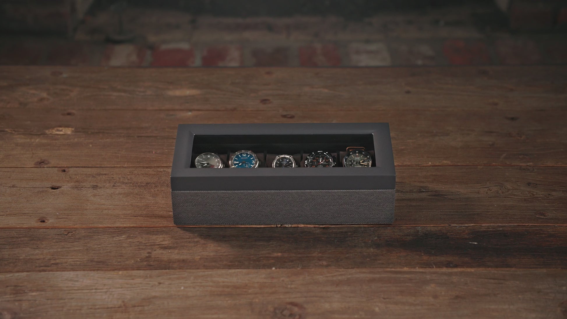 Merging solid wood construction with a plush interior, magnetic lid, and distinctive herringbone texture, all under a real glass top. This modern, two-toned wood display case offers your watches a home that’s as elegant as it is innovative.