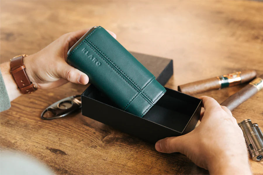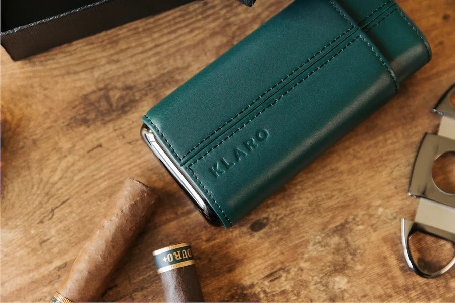 Keep your favorite cigars safe and secure wherever you travel with the Klaro Three-Cigar Leather Travel Case. This luxurious travel case features a Spanish-cedar lined interior that helps to keep your cigar fresh and is made with genuine leather you can smell out of the box. This travel-ready humidor case makes it easy to transport up to 60-ring gauge cigars, which means no more leaving larger favorites at home. It includes polished gunmetal ends for added luxury and protection, with supreme stitching on every edge. Personalize your case with initials, making this the ultimate cigar-lover gift.
