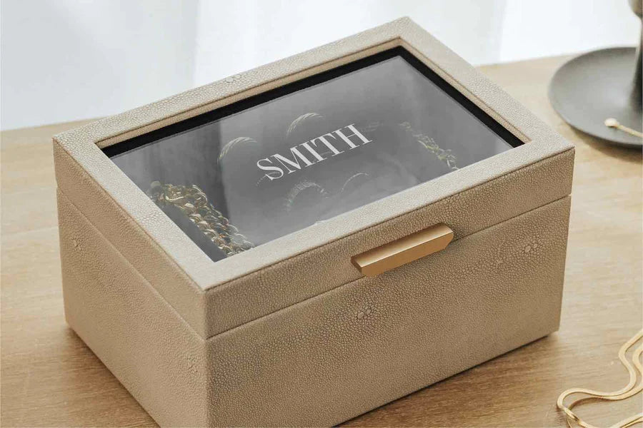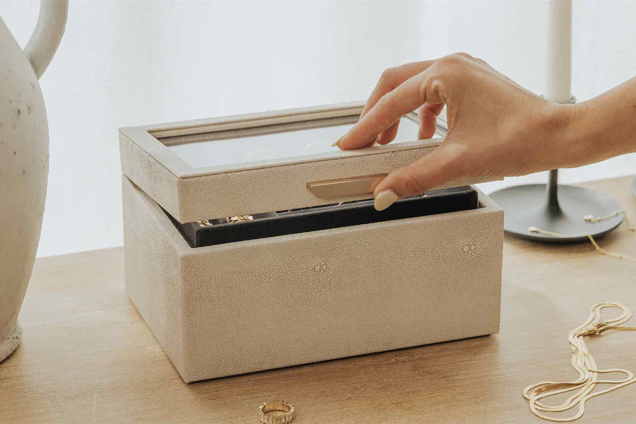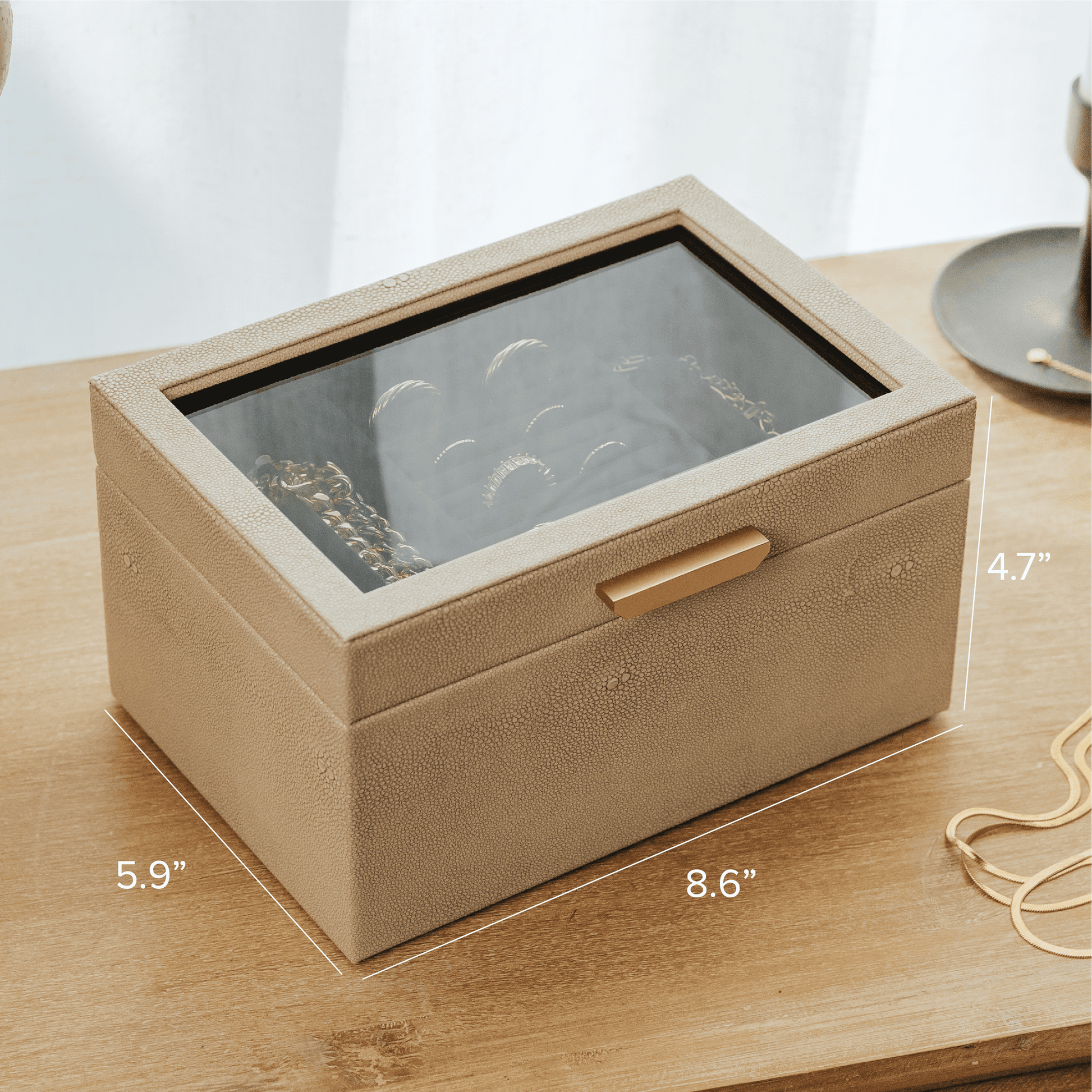 The Sasha petite jewelry box is the perfect size for those with a modest amount of jewelry and little surface space. The curated exterior of this gorgeous box is wrapped in a vegan shagreen texture, the inside is draped with a top-of-the-line dark grey velvet plush, and custom molded handles that boast a rich satin bronze finish, giving it a truly luxurious feel. While petite in size, this storage box stores a surprising amount of jewelry in its three-tiered levels. Each level has been carefully designed to fit all sizes and styles of jewelry. Unique slots in the top level provide a unique way to store your necklaces so they don't tangle. Buttery soft, plush lined roomy storage trays cradle your jewelry, preventing unwanted scratches or blemishes. Properly display your jewelry collection with the genuine glass top lid. A stunning piece that you or your loved one will cherish for years to come.